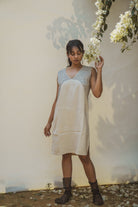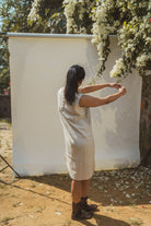Crafted in 100% cotton fibres and natural materials. This Twill cotton dress featuring a V-neck and fabric loop buttons at the back is undyed and unbleached. A breezy trans-seasonal dress that is perfect for a day out in summer or can be layered to achieve the perfect winter outfit.
