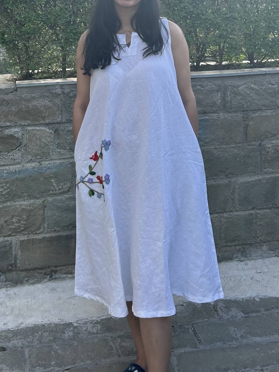 Step into timeless elegance with the White Birds & Blossoms Linen Dress. Crafted from premium linen, this sleeveless dress features a round neck with a center slit and a flared fit for effortless movement. With pockets on both sides and intricate crochet details of flowers and birds, it can be styled as both a kurta and a dress.