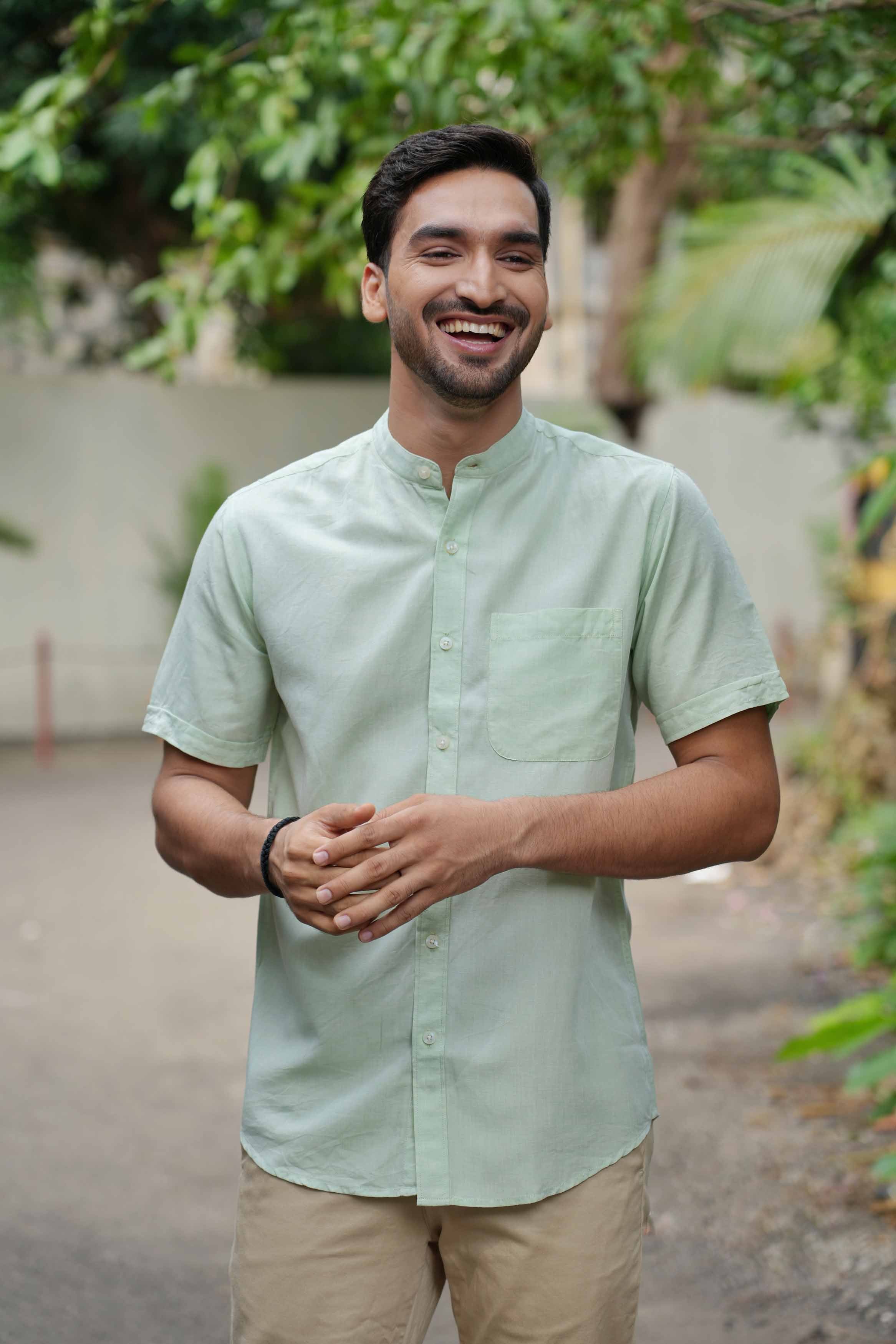 Earthy Route TENCEL Lyocell Linen Fresh Green Half Sleeve Mandarin Collar Shirt
