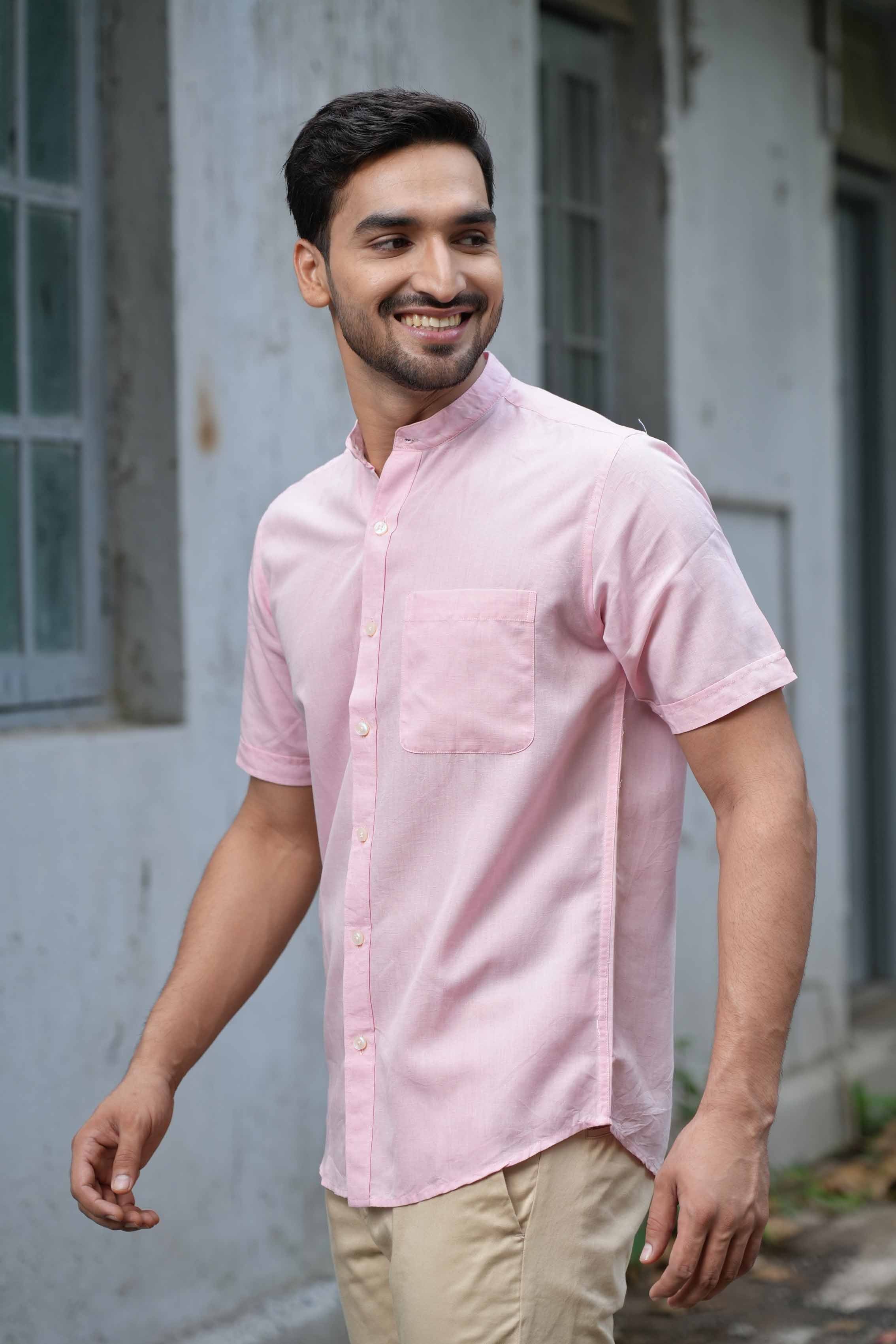 Earthy Route TENCEL Lyocell Linen Charm Pink Half Sleeve Mandarin Collar Shirt