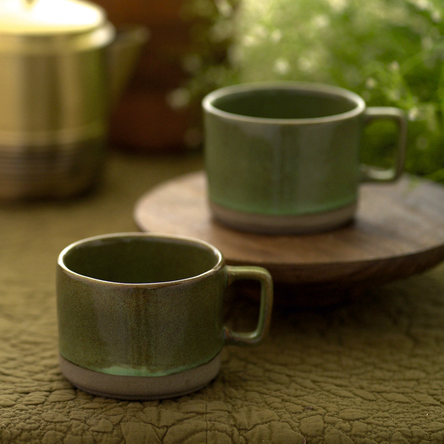 Bhor Pista Coffee Mug is hand cast with love and artistry. The two-tone finish juxtaposes the glazed green colored surface with natural earthy grey of the ceramic. The classic timeless simplicity of medieval pottery reflects through reactive glazes making each piece unique and exclusive.