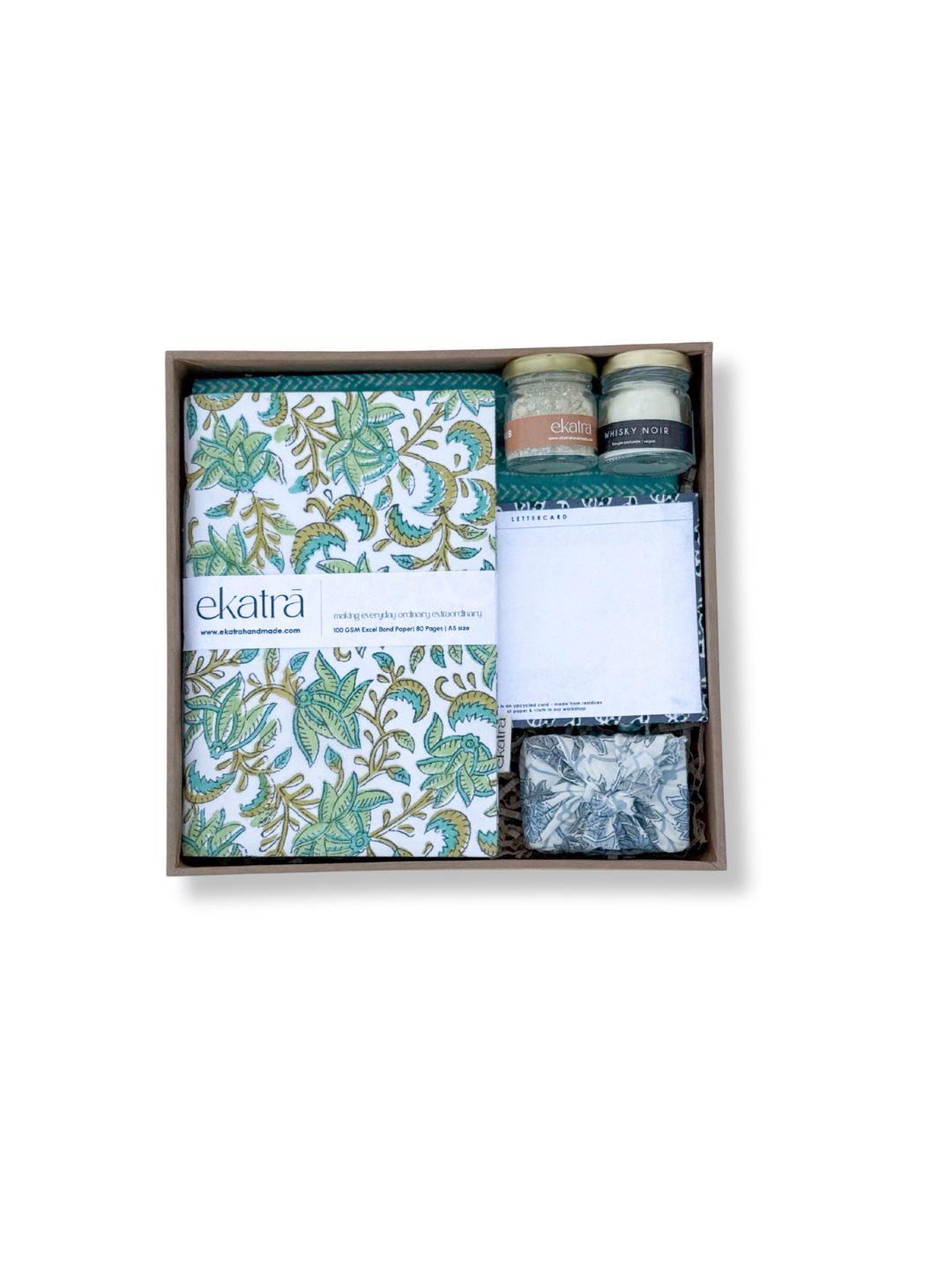 The hamper is packed with : A5 Journal Handstitched pouch Essential oils bath bar Scented Candle Face scrub Notecard
