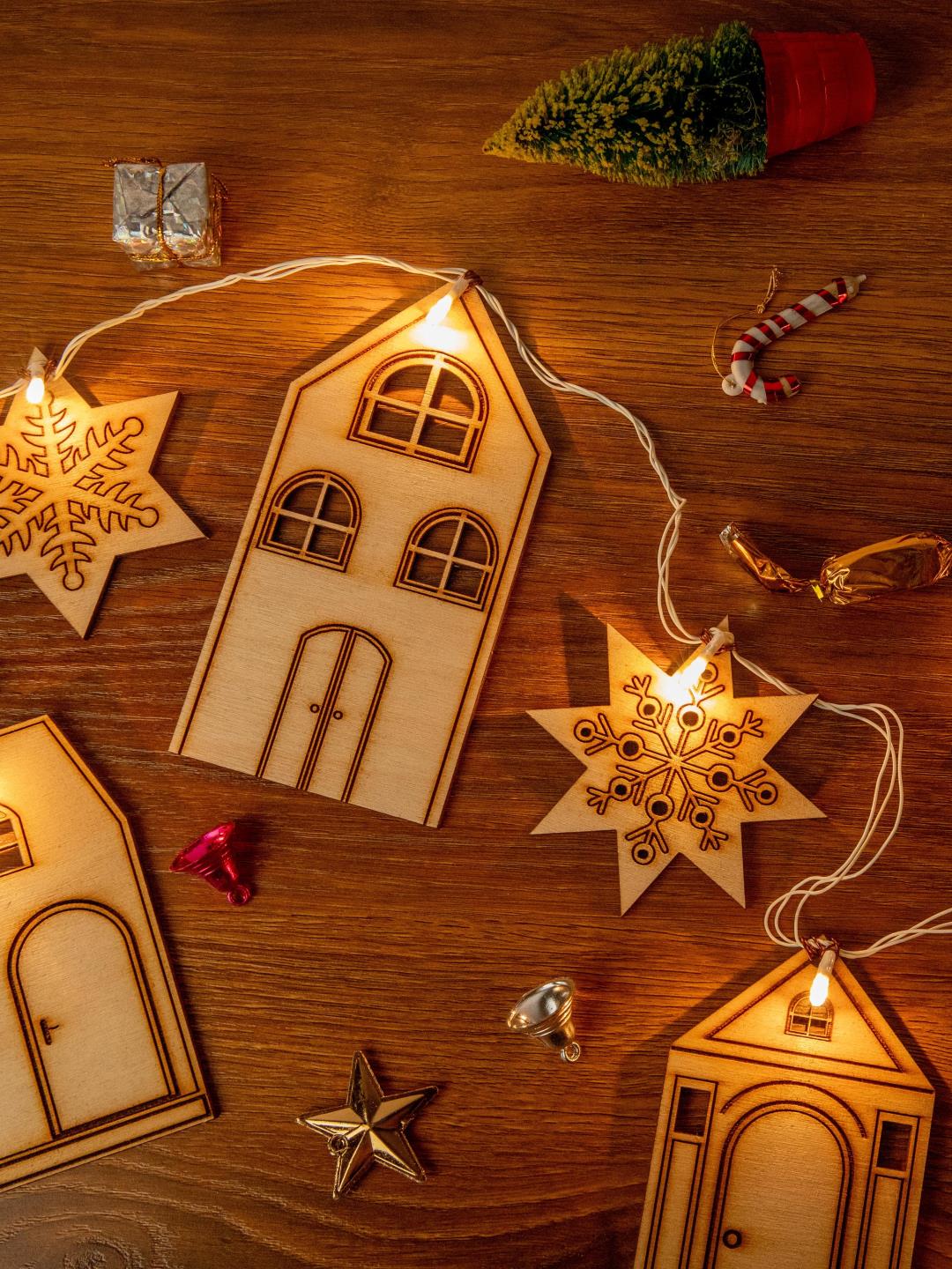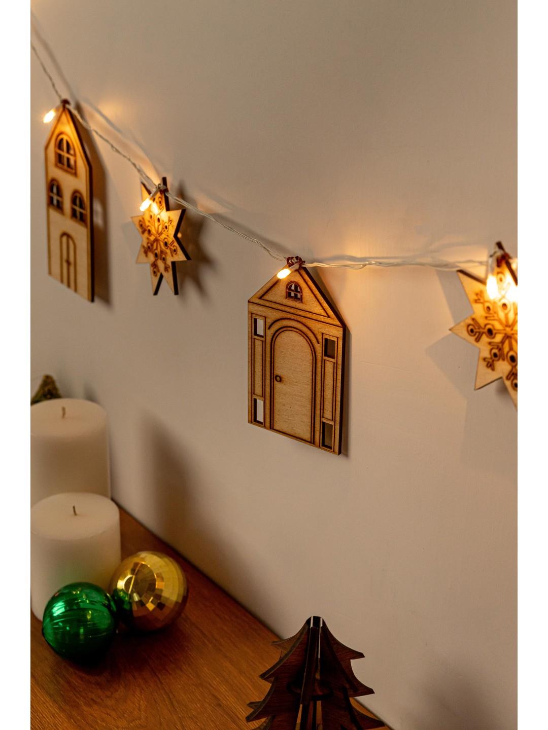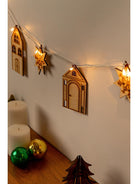 - The bunting has 5 houses and 6 stars made of Birchwood and are intertwined with a LED light of 3 meters.