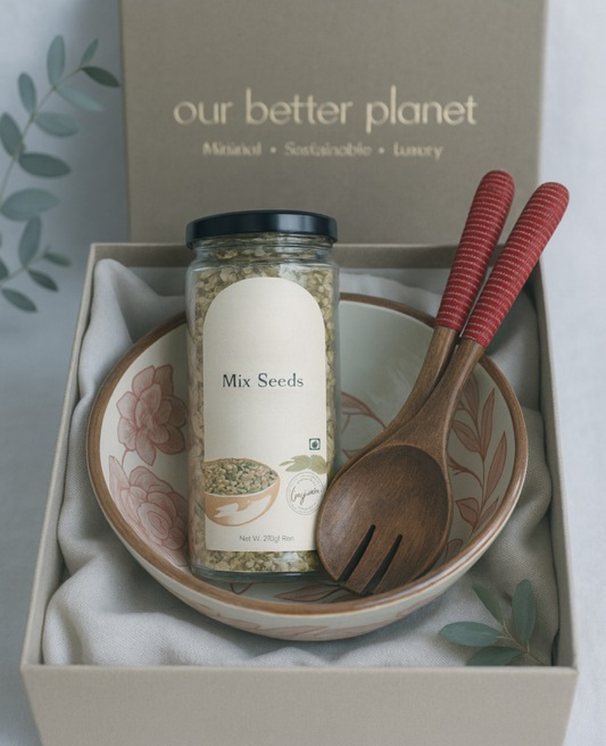 Encourage wellness with OurBetterPlanet’s Healthy Indulgence Set. A mindful curation of nutrient-packed seeds and a handcrafted bowl, this hamper is a perfect balance of health and elegance.