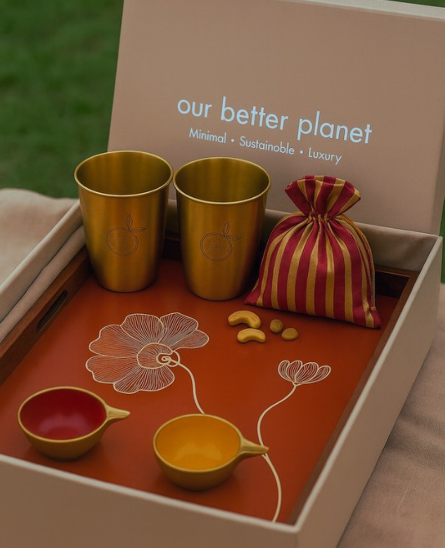 Celebrate tradition and elegance with OurBetterPlanet’s Regal Brass & Wood Set. This luxurious hamper blends timeless brassware with eco-friendly wooden craft, offering a festive curation that’s both functional and beautiful. Perfect for gifting during celebrations, it reflects a harmony of wellness, heritage, and sustainable living.