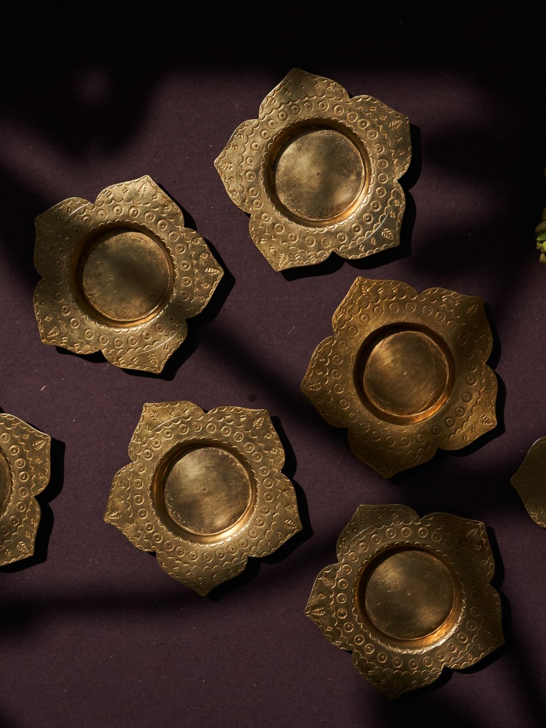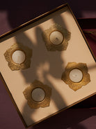 Recycled and hand stamped brass tea light holders with our TICP playing cards inspired by Rajasthani Miniature Art - in a gift box to brings a sense of calm, happiness, prosperity, and abundance in every household.
