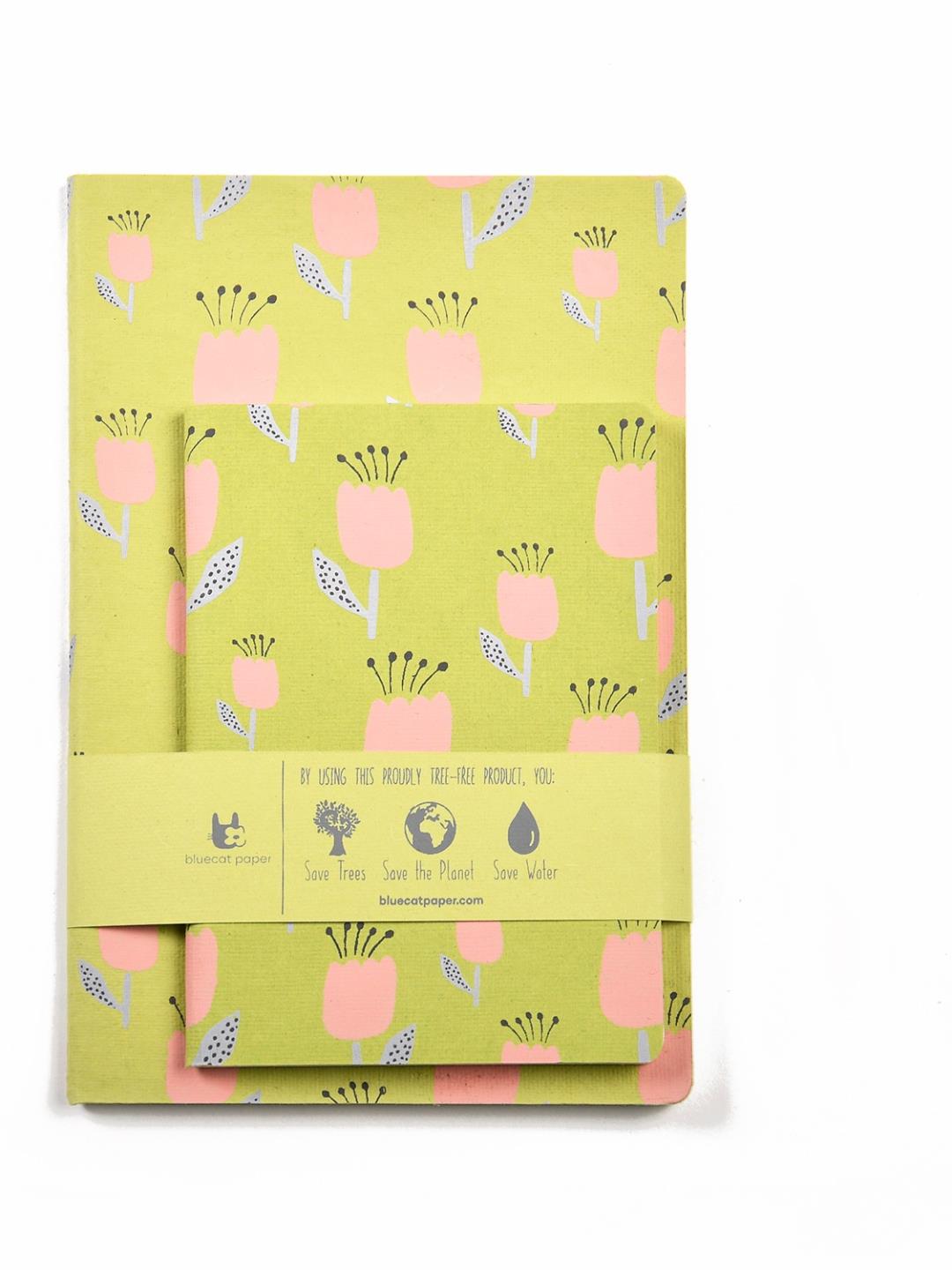 Handmade and designed with elegant floral tulips designs. Screen printed with water-based inks. Premium quality, perfect for journaling, note-taking, or drawing. They are a great size to take wherever you go. The paper is acid-free and eco-friendly. Our handmade notebooks are created from 100% Tree-free paper. It is up-cycled and recycled.