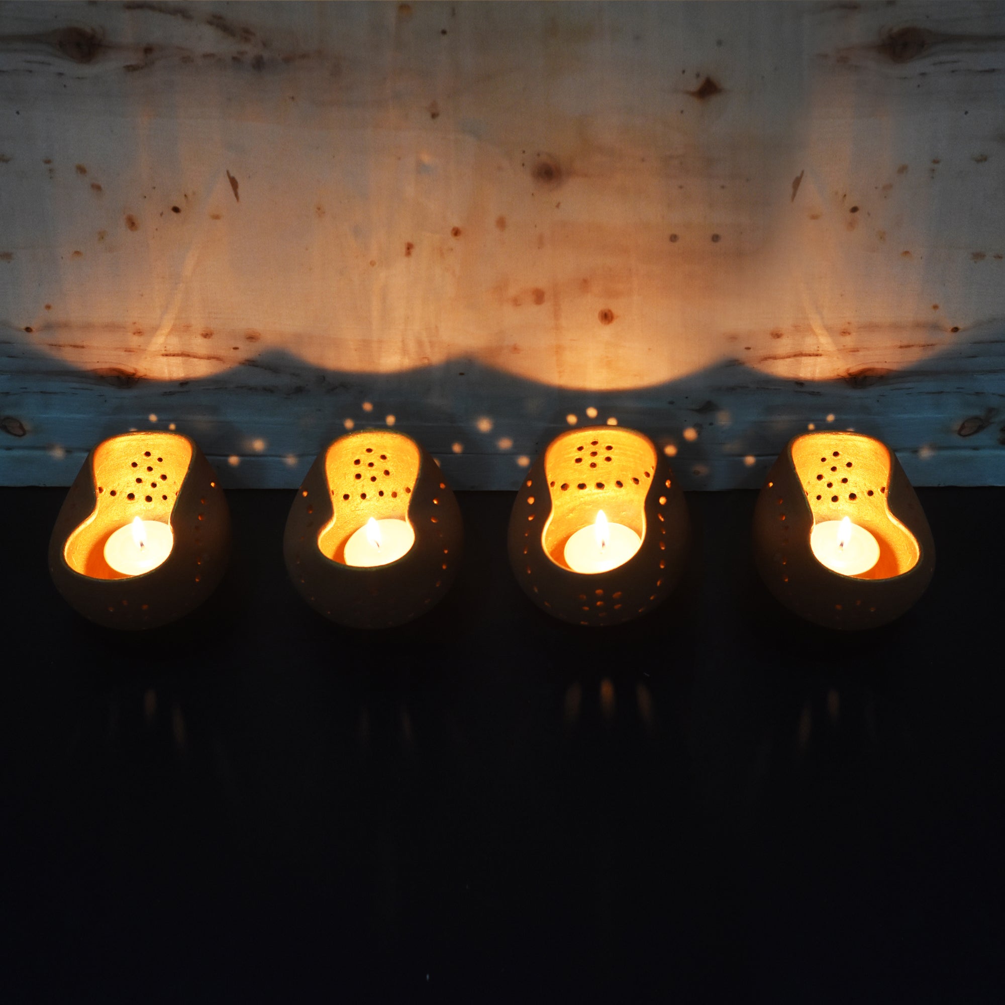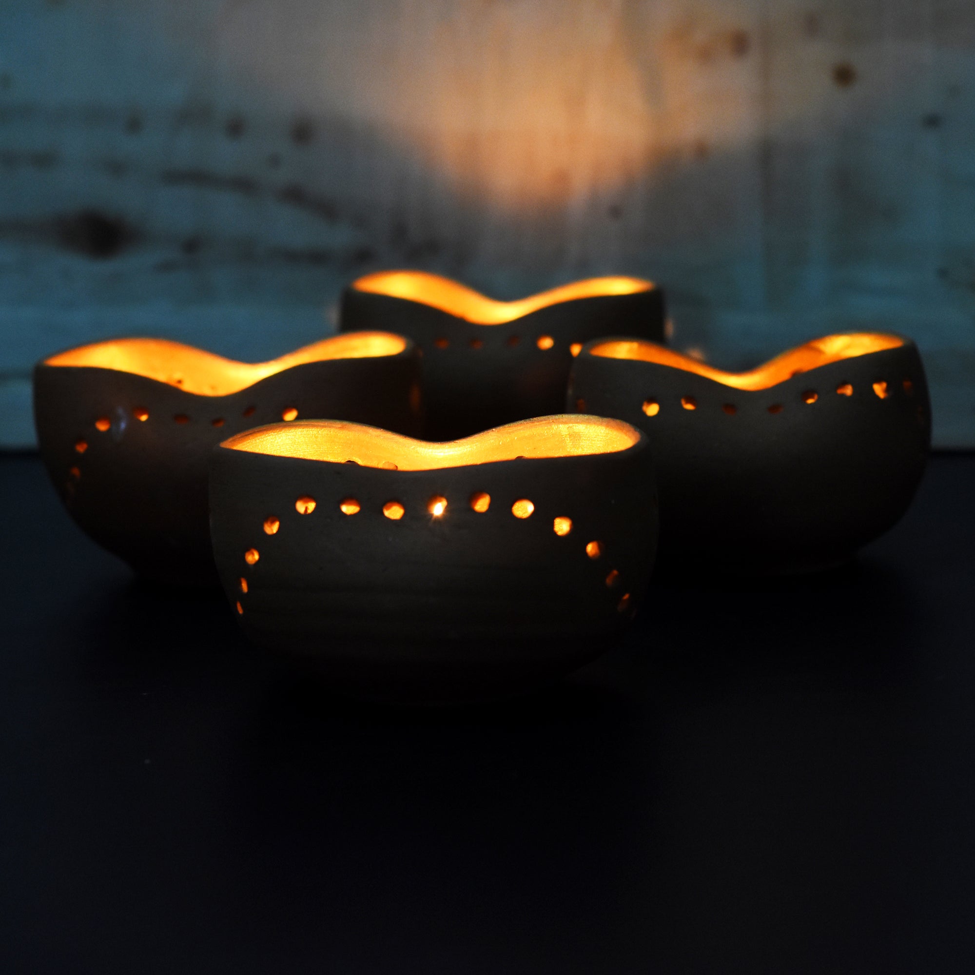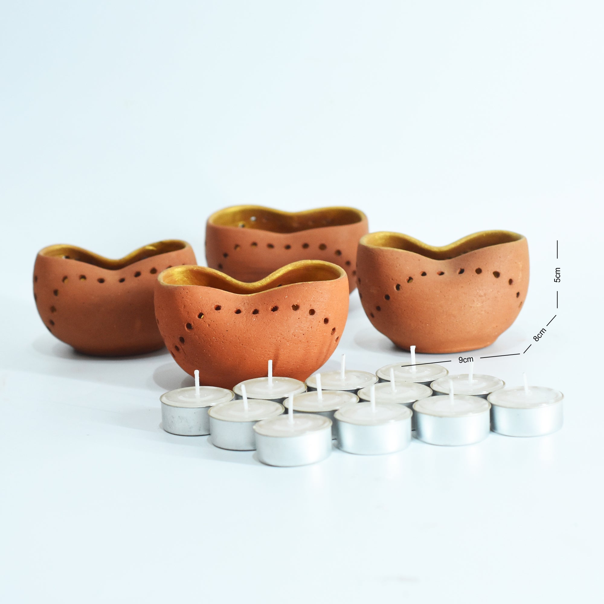 Package contains : 4 terracotta clay candle stand + 4 complimentary tealight candles