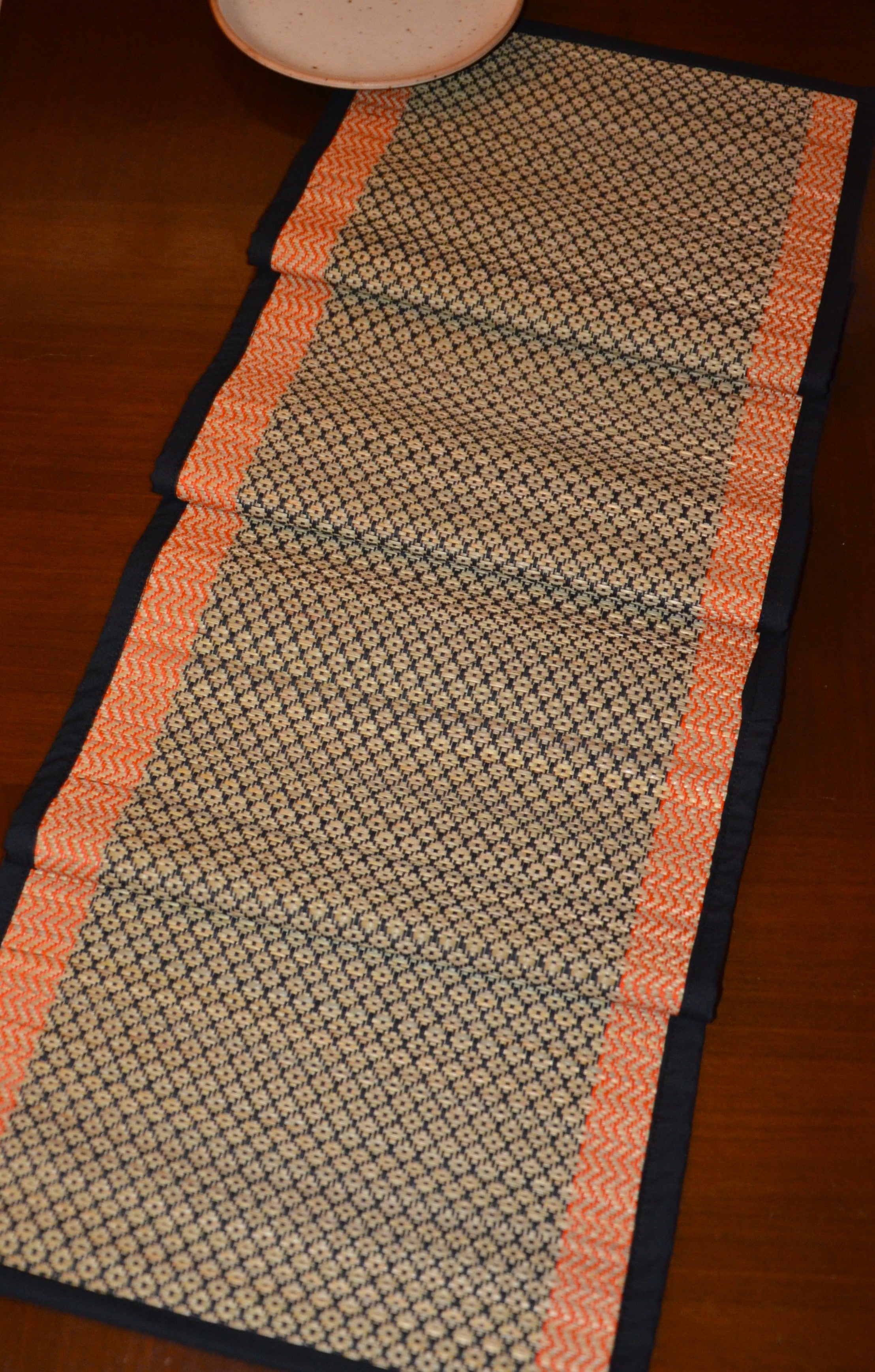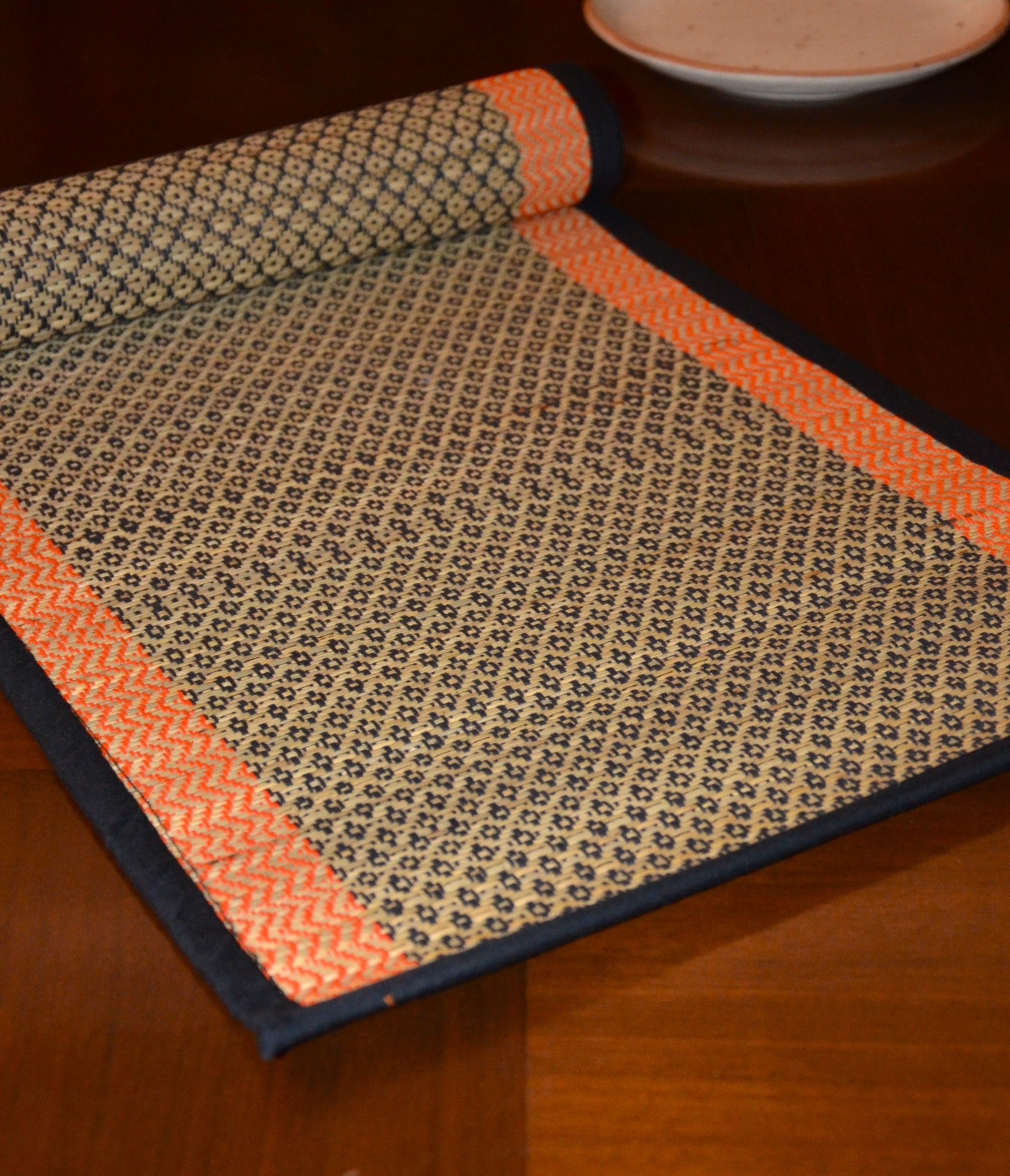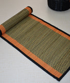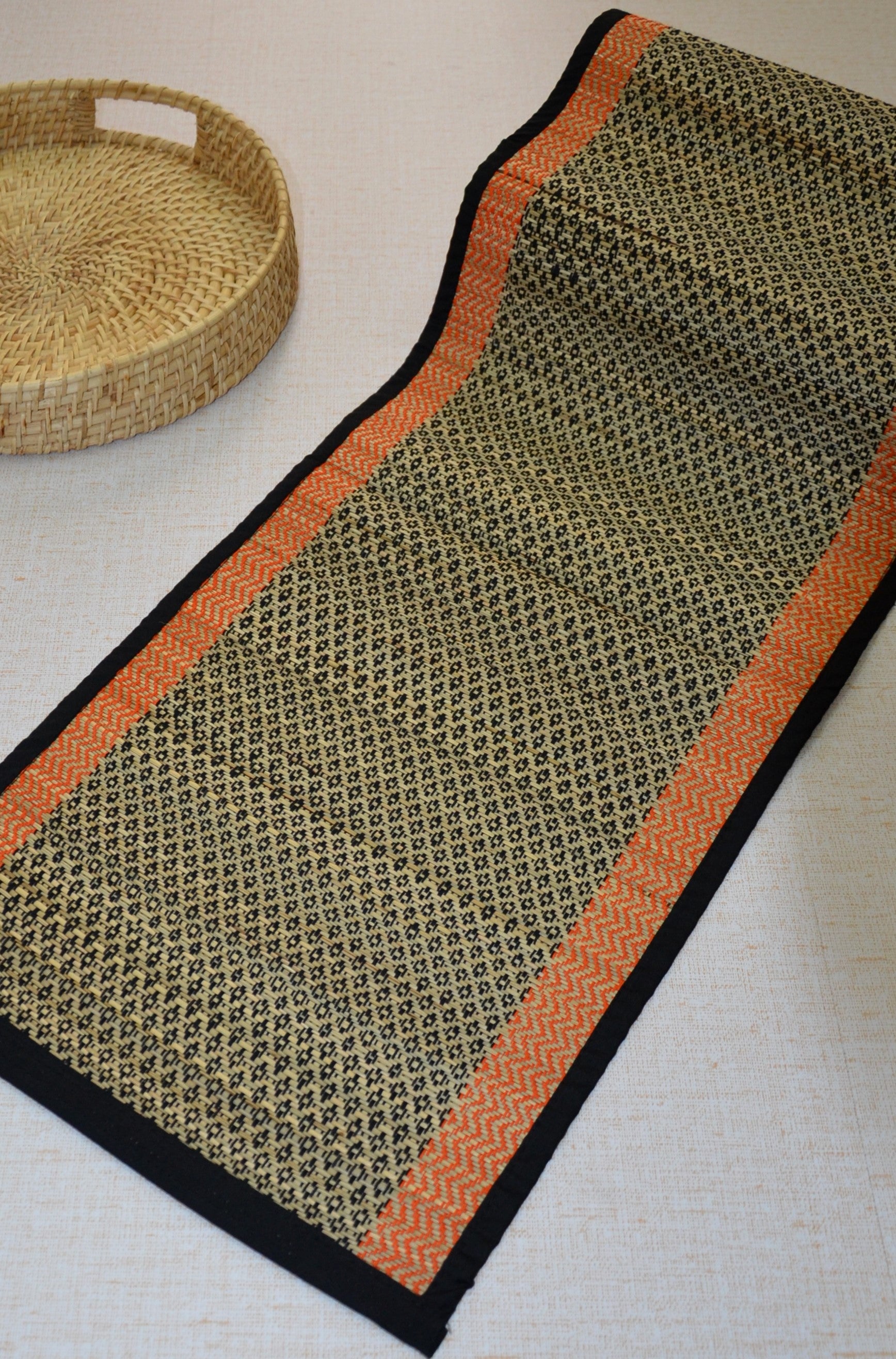 Eco-friendly and natural table runner handcrafted of Madurkathi reed and beautifully interwoven with thread in a diamond pattern.