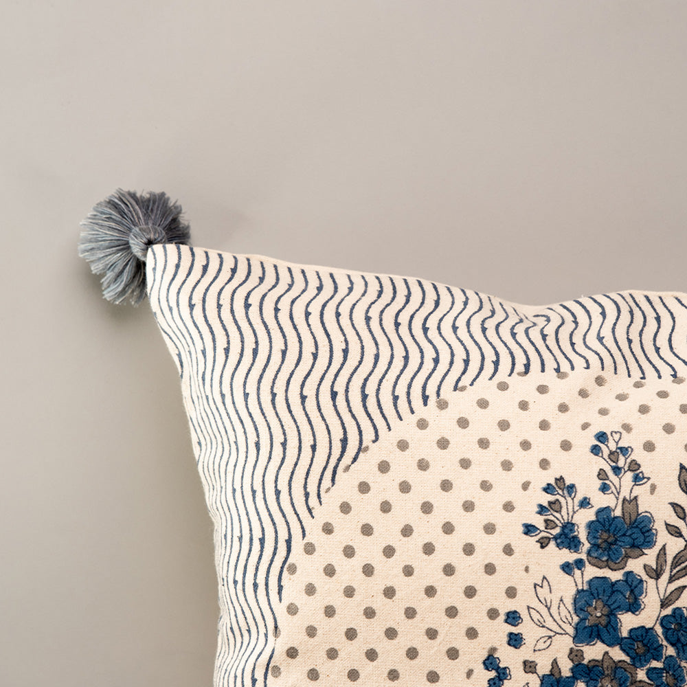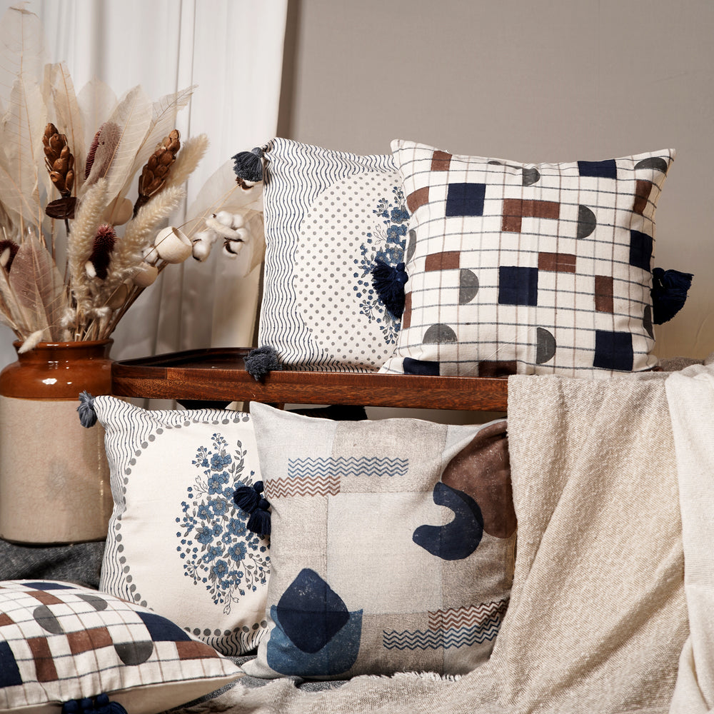 From Twilight's Hush to Dawn's First Light, Timeless Glamour Unveiled. Each cushion is adorned with a concealed zipper and stylish tassels for a touch of sophistication. With hues of Brown, Navy Blue, Grey, Light Grey.