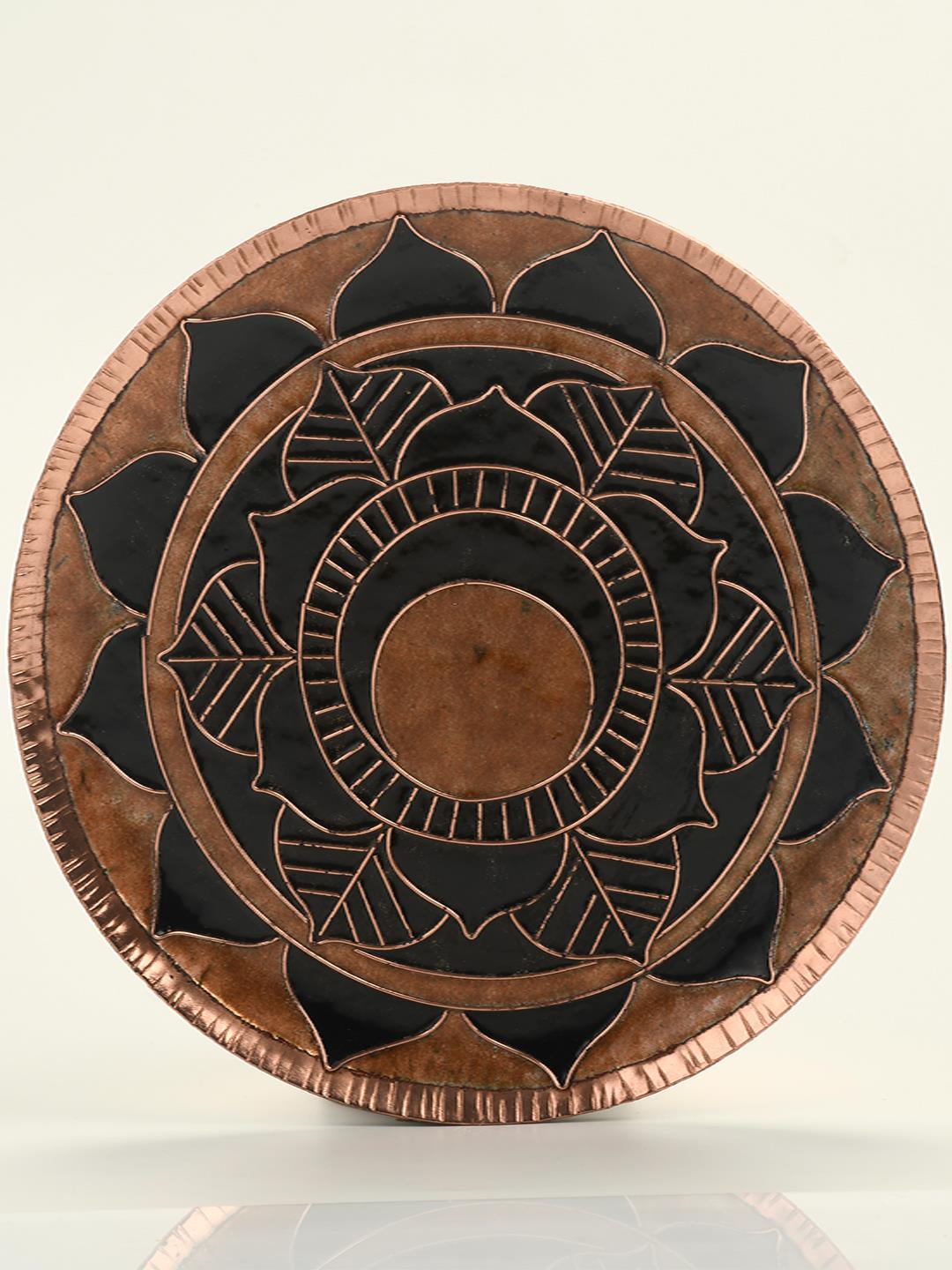 This collection of handmade copper enamel wallplates and tealights is inspired by the festival of Makar Sakranti. This particular Copper enameling plate is hand crafted by our team of artisans from the western ghats of Maharashtra, India. Copper Enameling is the age-old craft of fusing glass onto the copper surface for color enrichment. The glass powder is laid onto the copper surface in the requisite patterns and the assembly is heated to 700 to 900°C, at which point the powdered glass melts to form a coat on the copper surface. This glass enameling not only lends its vibrant colors to the copper surface, but also prevents it from oxidizing, thereby rendering it more usable