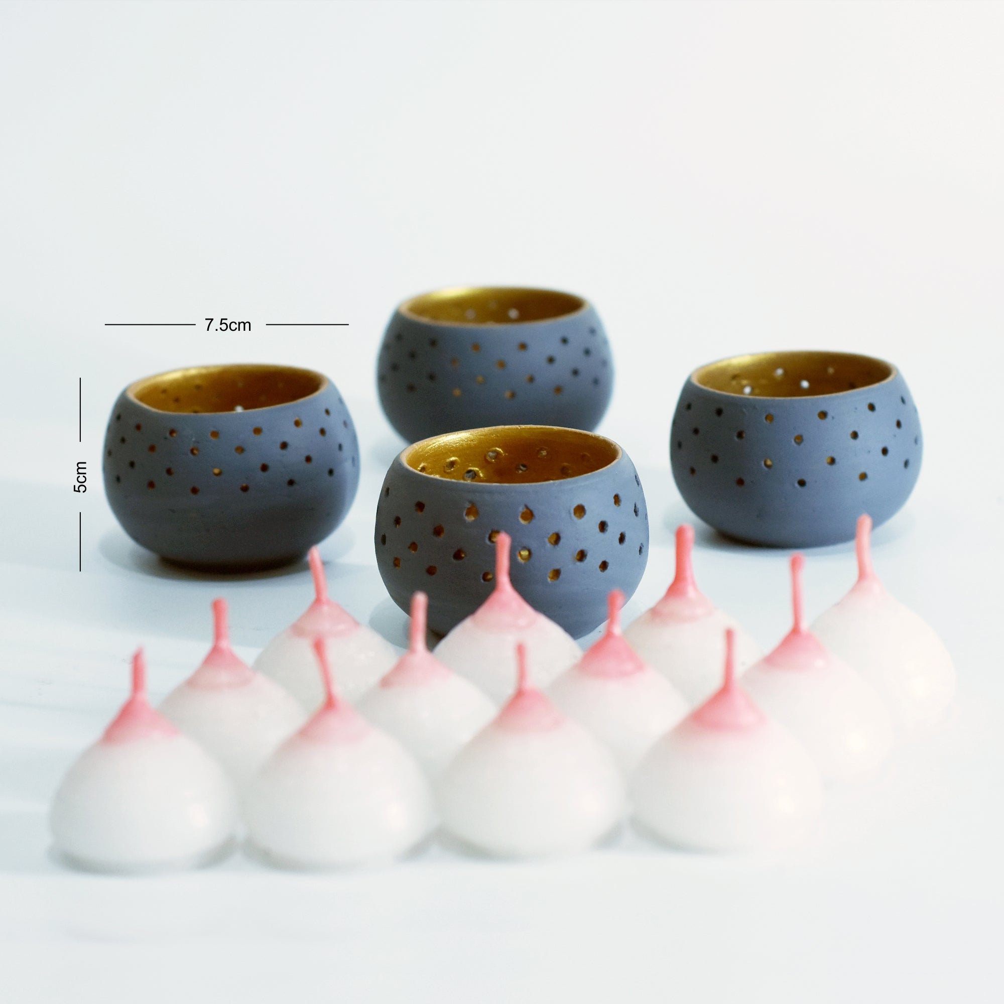 Grey Outer & Golden Inner "DOME" Tealight Pots / Holders : Set of 4 + complimentary 4 tealights/candles