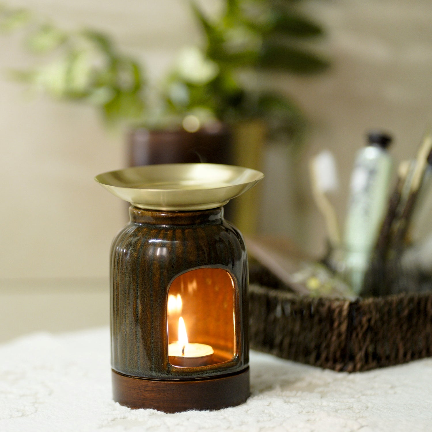 Celebrating the ancient tradition of purifying home space, the Gulfam Oil burner harmonizes hand-cast ceramic, Sheesham and brass to bring ambient perfumery.