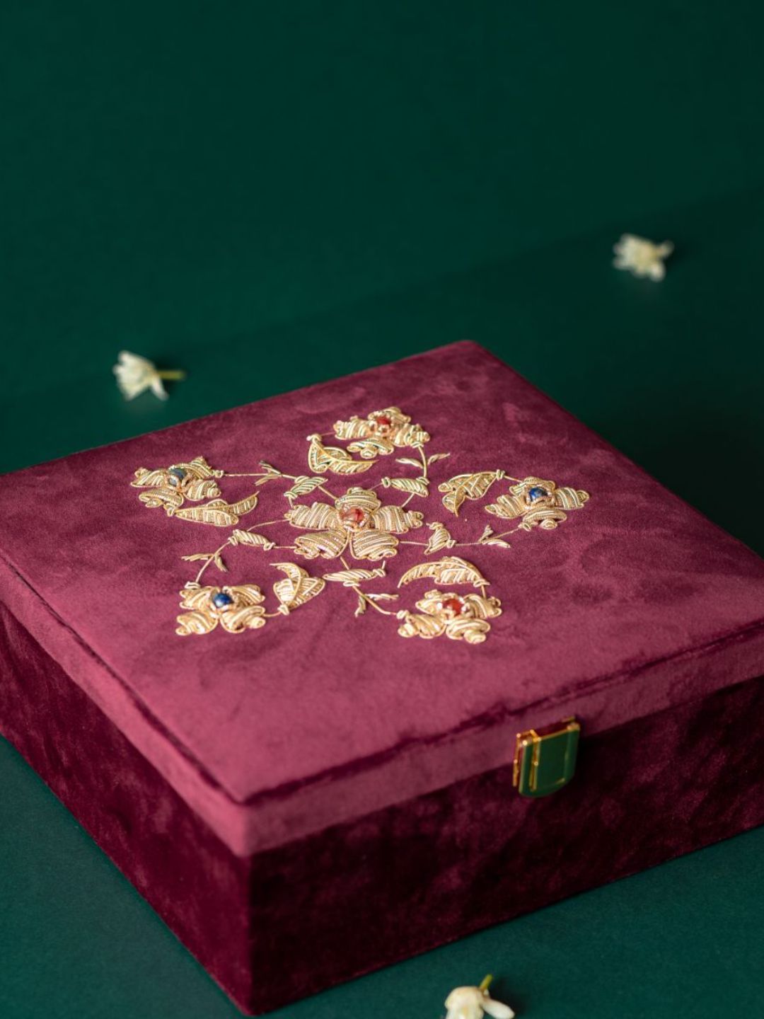 Straight from the ancient 'gharanas' of India, TICP brings to you an elegant Zardozi Gift box. With intricate floral pattern, we can vouch that this eternalized embroidery will never wither, just like the beautiful bonds you share with your loved ones.