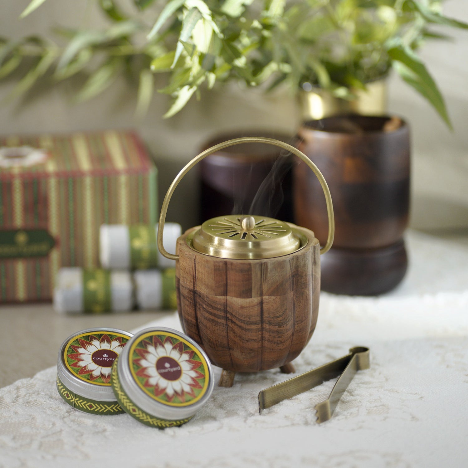 Crafted in wood and the inside lined with brass, Kangra Fumer comes with delicately etched lid and brass accent handle. The gift box includes natural resin, charcoal pellets and brass tong along with the main dhuna.