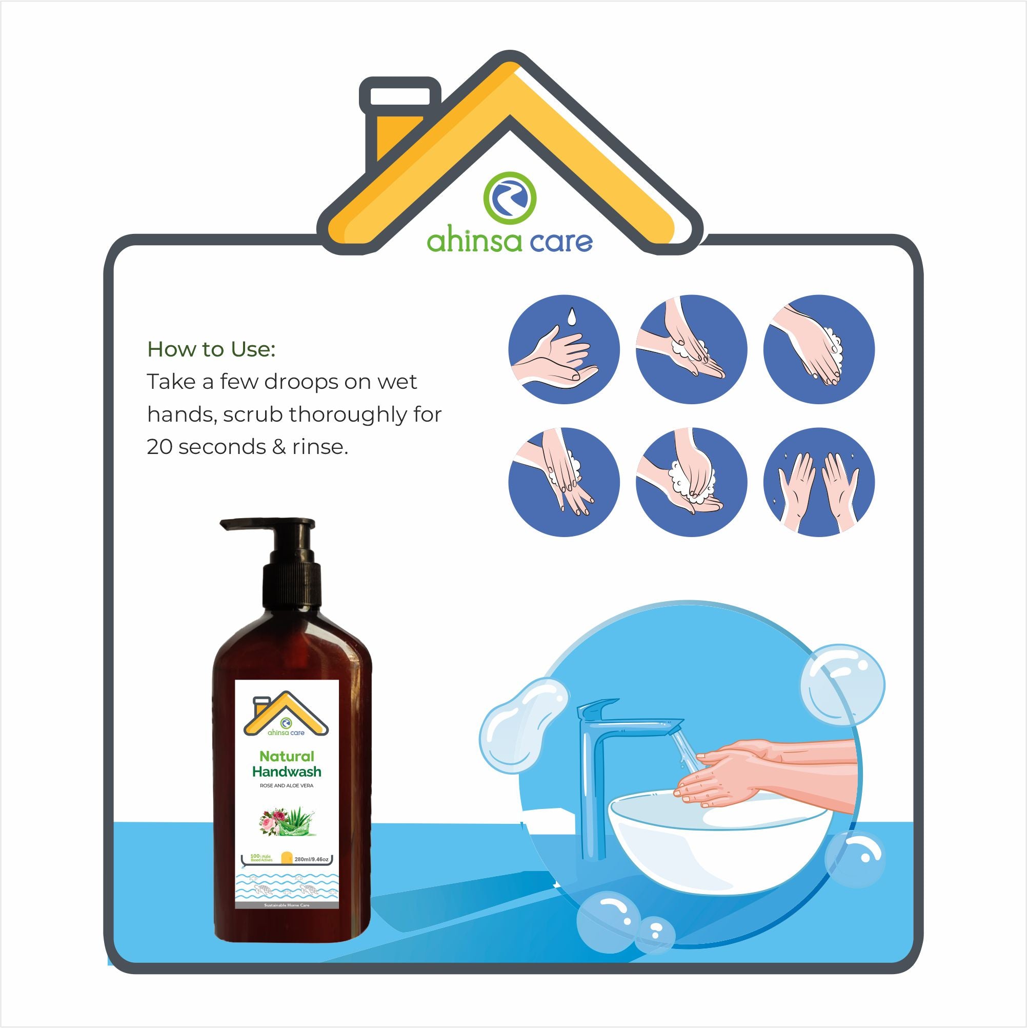 HOW TO USE: Achieve clean, refreshed hands effortlessly. Wet hands, dispense Ahinsa Care Natural Handwash, lather, scrub for 20 seconds, rinse, and pat dry. Enjoy!