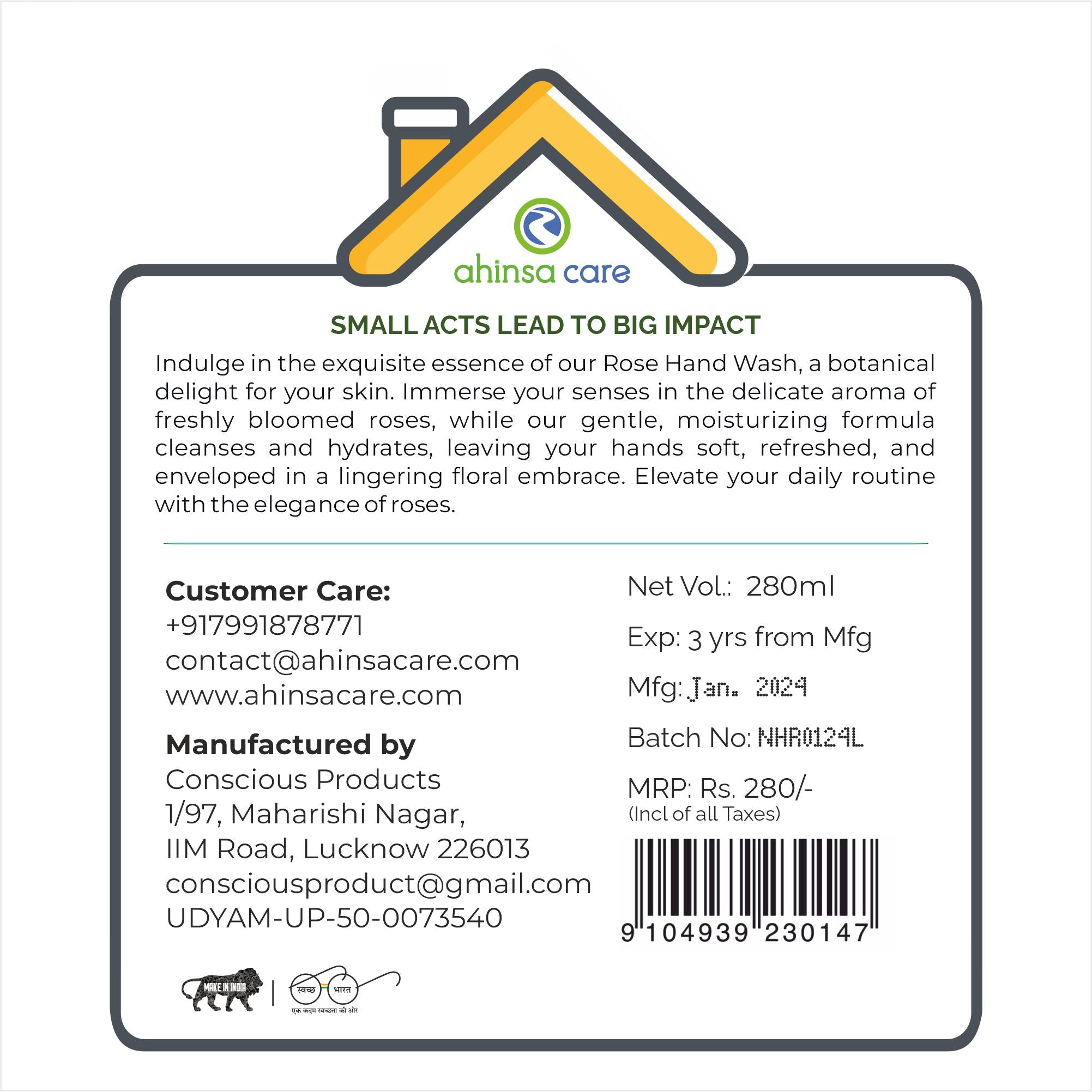 Introducing Ahinsa Care Handwash your go-to for clean, moisturized hands. With a gentle formula and refreshing scent, it's the perfect addition to your daily routine, ensuring cleanliness without compromise.
