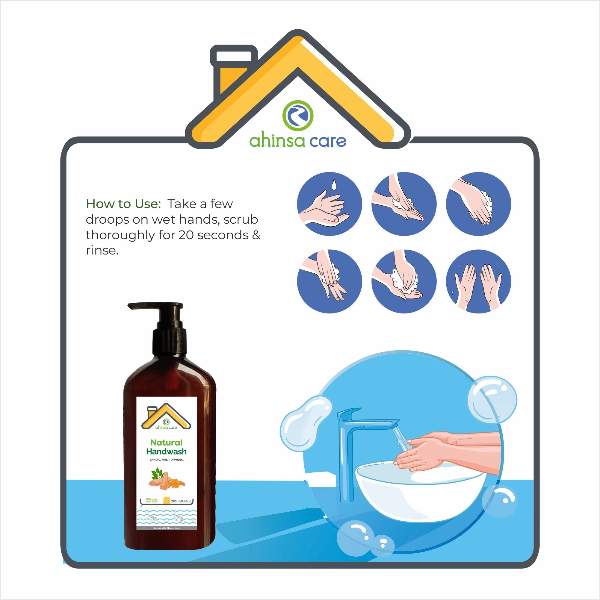 HOW TO USE: Achieve clean, refreshed hands effortlessly. Wet hands, dispense Ahinsa Care Natural Handwash, lather, scrub for 20 seconds, rinse, and pat dry. Enjoy!