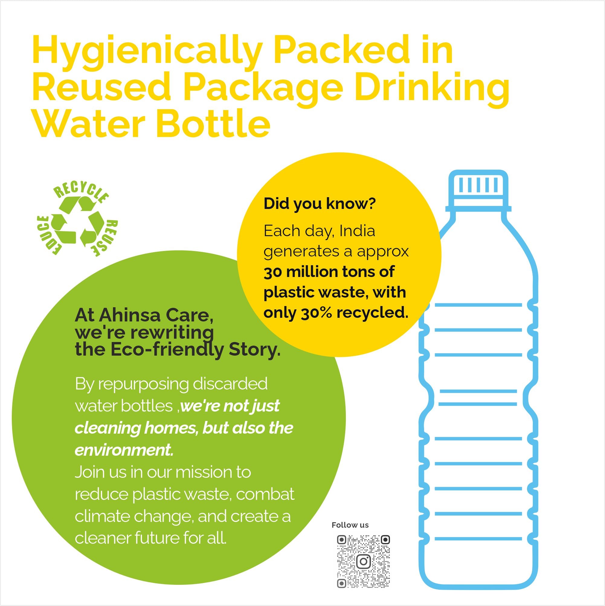 RECYCLABLE PACKAGING: Hygiencally packed in reused Package drinking Water Bottles. No new plastic is generated from your Homes