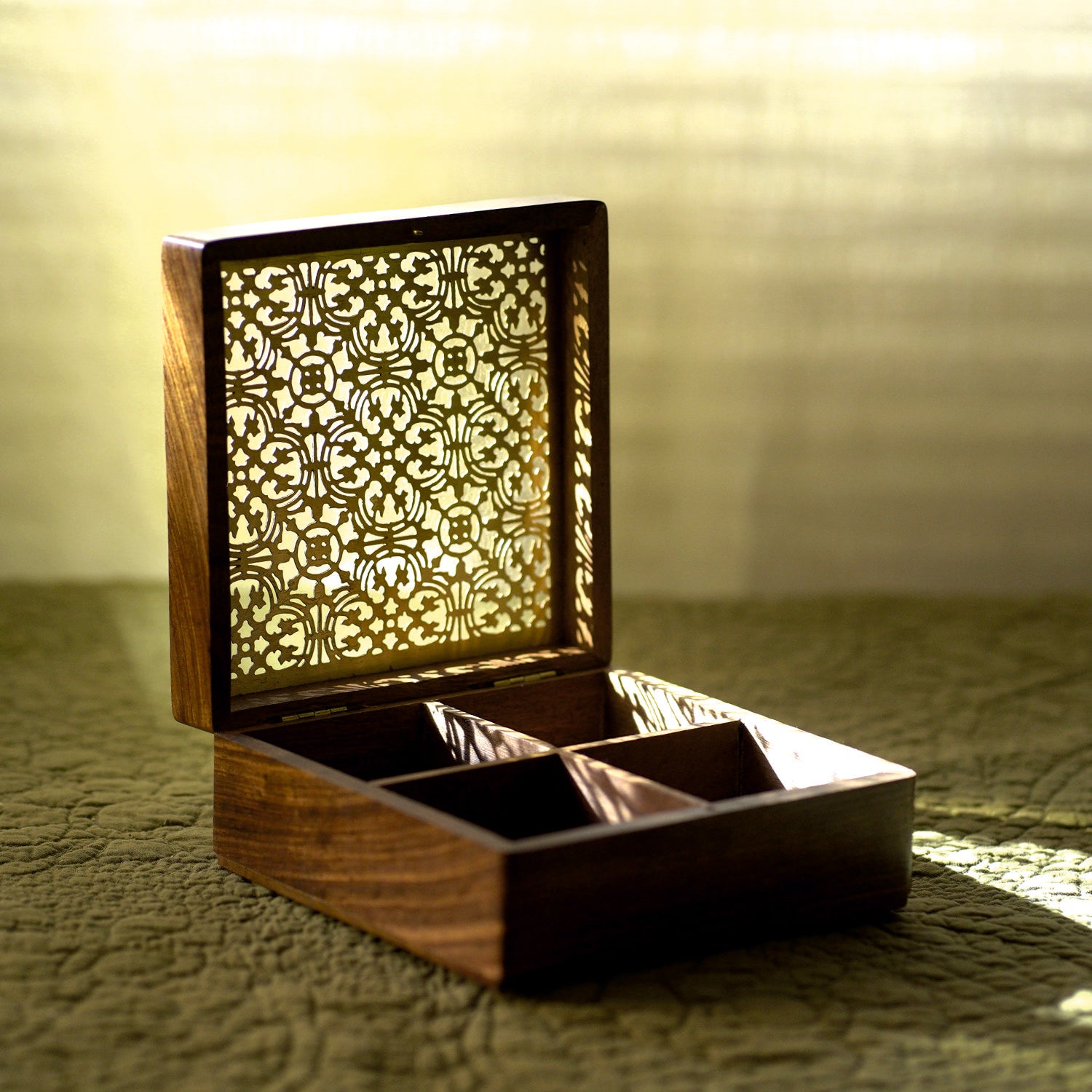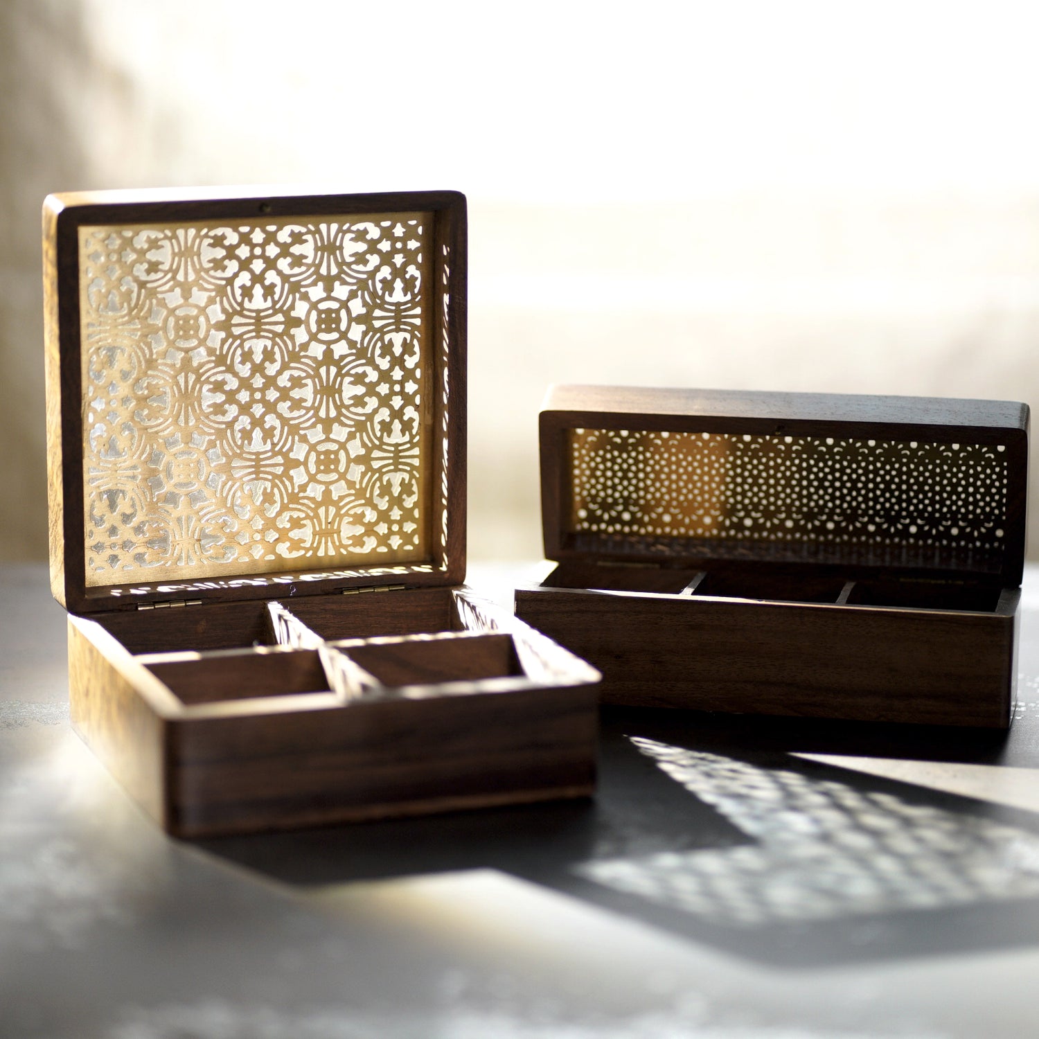The charming sandookchi of the golden era are the essence of the Kosh Pavitra Box. Partitioned in 4 parts, this clean and smooth Sheesham box has an intricately etched design in brass, sandwiched between clear glass.