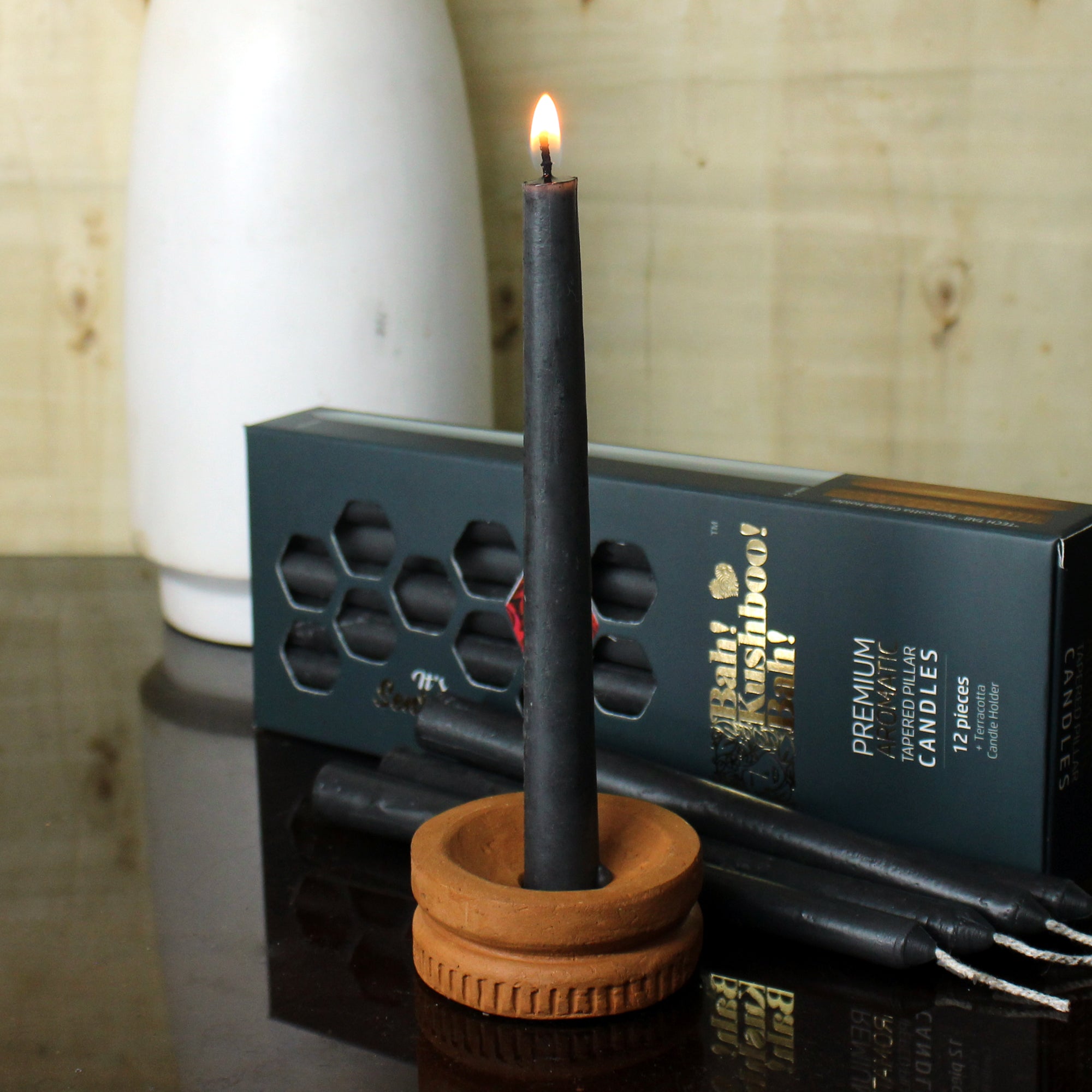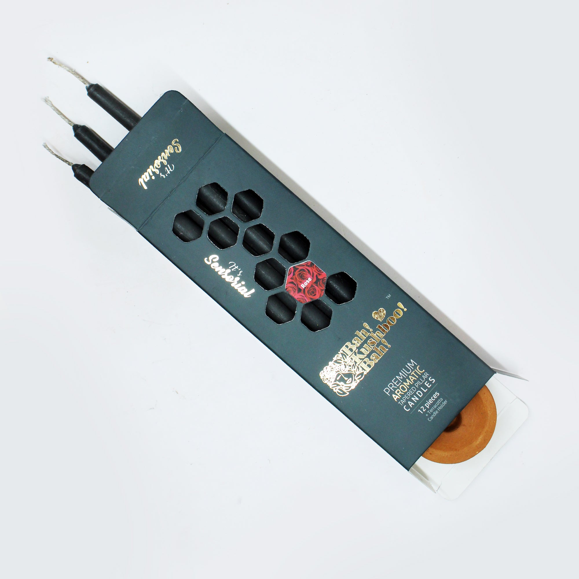 ROSE Premium perfumed TAPERED CANDLE STICK in DARK GREY colour. The dark grey colour makes the candle stick almost invisible and only the flame looks like a floating tinly fire. Aroma is very sweet in nature. Intentionally we kept the aroma controlled so that it gives a smooting cool effect in your senses.