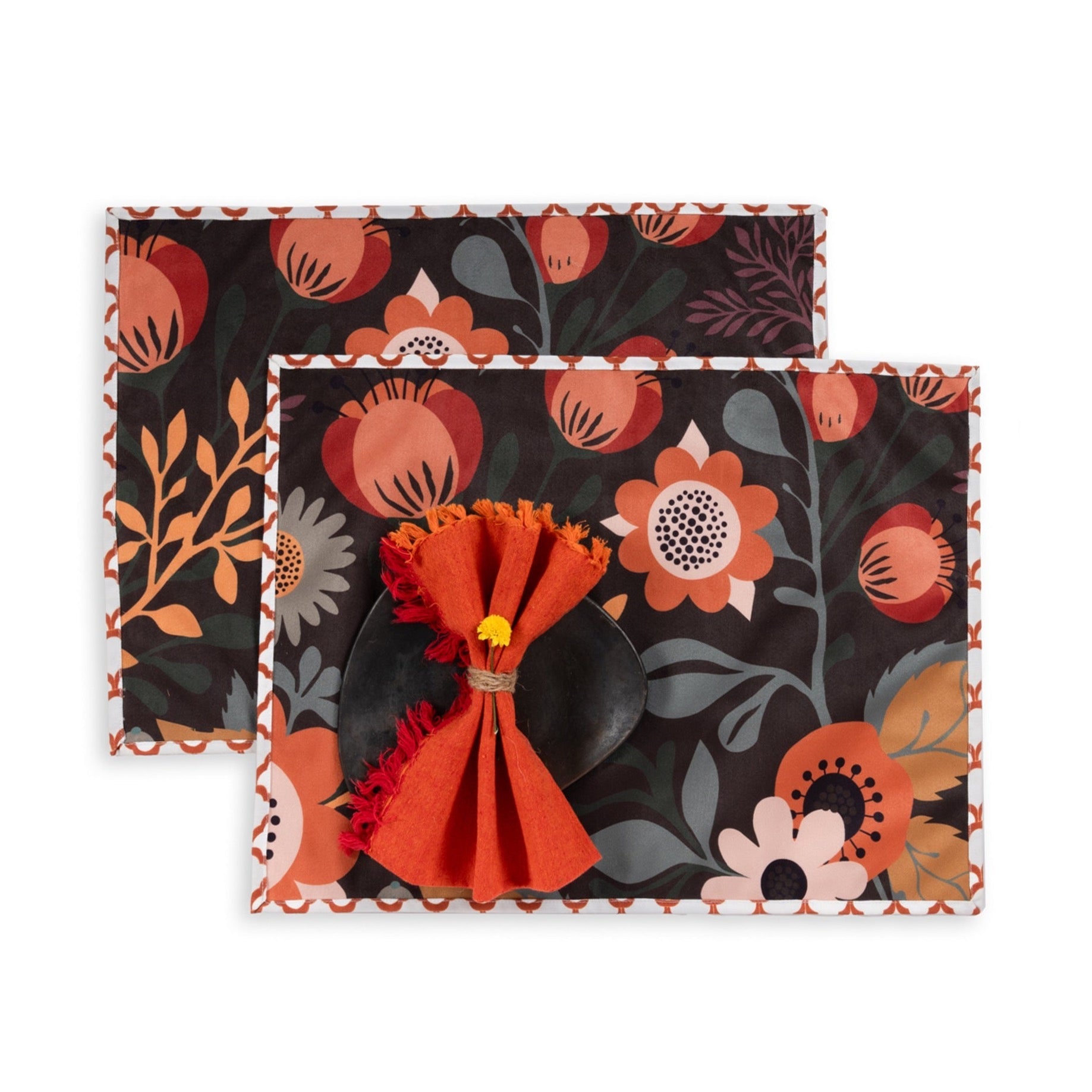 Introducing the "Autumnal Foliage Rustic Table Mat," a celebration of the rich and earthy hues of fall foliage that brings a touch of the outdoors to your dining experience. This captivating table mat features an intricately designed array of foliage in varying shades of rust, creating a warm and inviting atmosphere for your table setting.