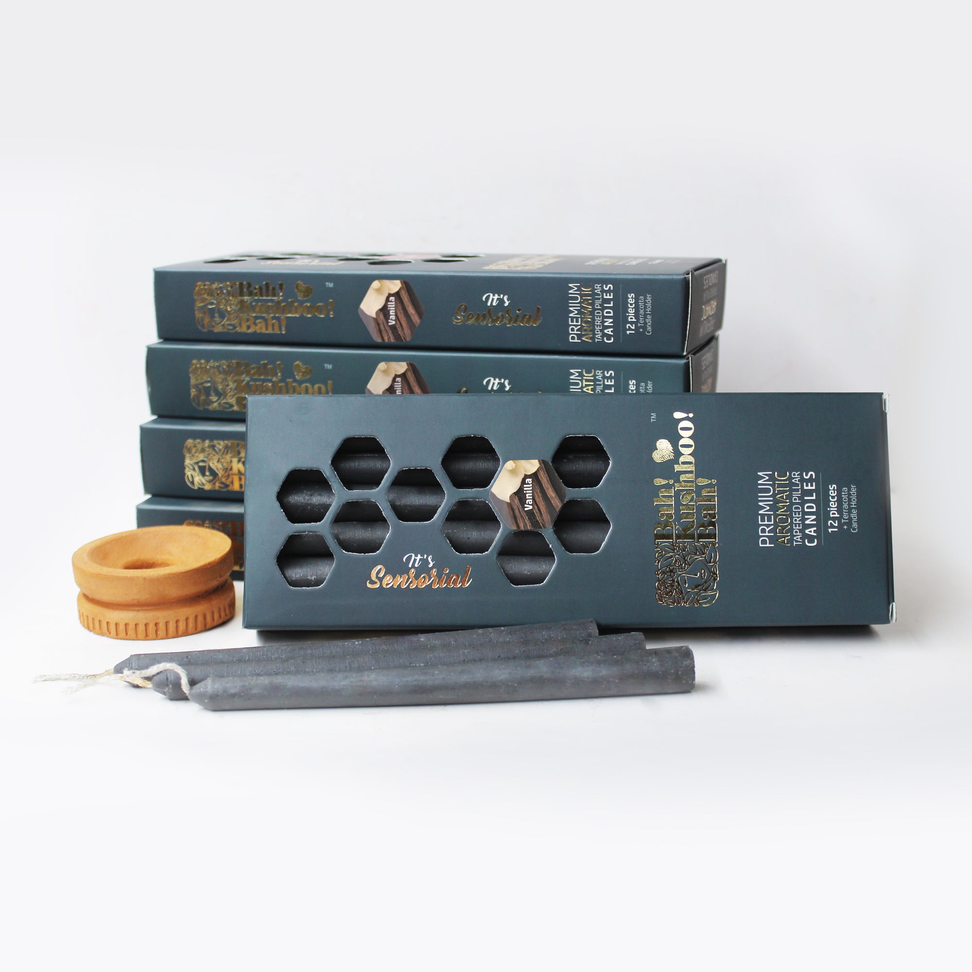 VANILLA Premium perfumed TAPERED CANDLE STICK in DARK GREY colour. The dark grey colour makes the candle stick almost invisible and only the flame looks like a floating tinly fire. Aroma is very sweet in nature. Intentionally we kept the aroma controlled so that it gives a smooting cool effect in your senses.