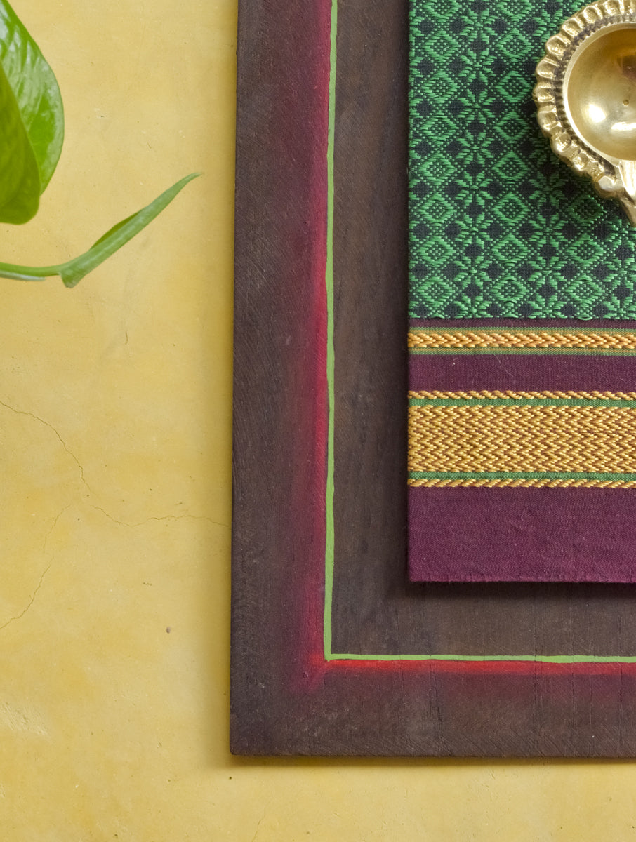 kāṃsya by Ba No Batwo is a handcrafted collection of vintage wallart, handcarved in repurposed teak wood/MDF, Traditional Khun Fabric, handpainted in miniature, pattachitra and distressed style. The vintage style brass ornament adds uniqueness to each piece.