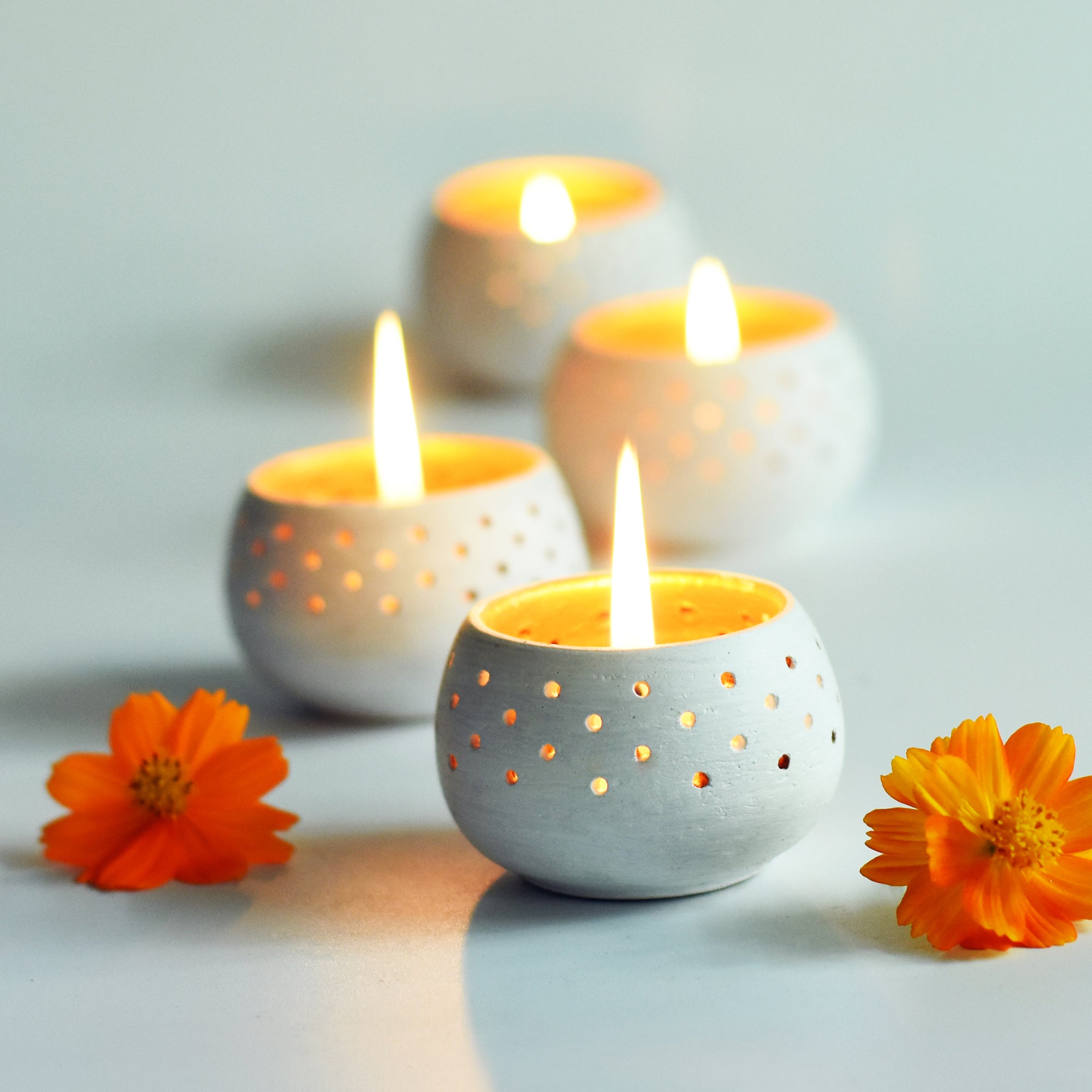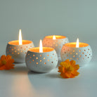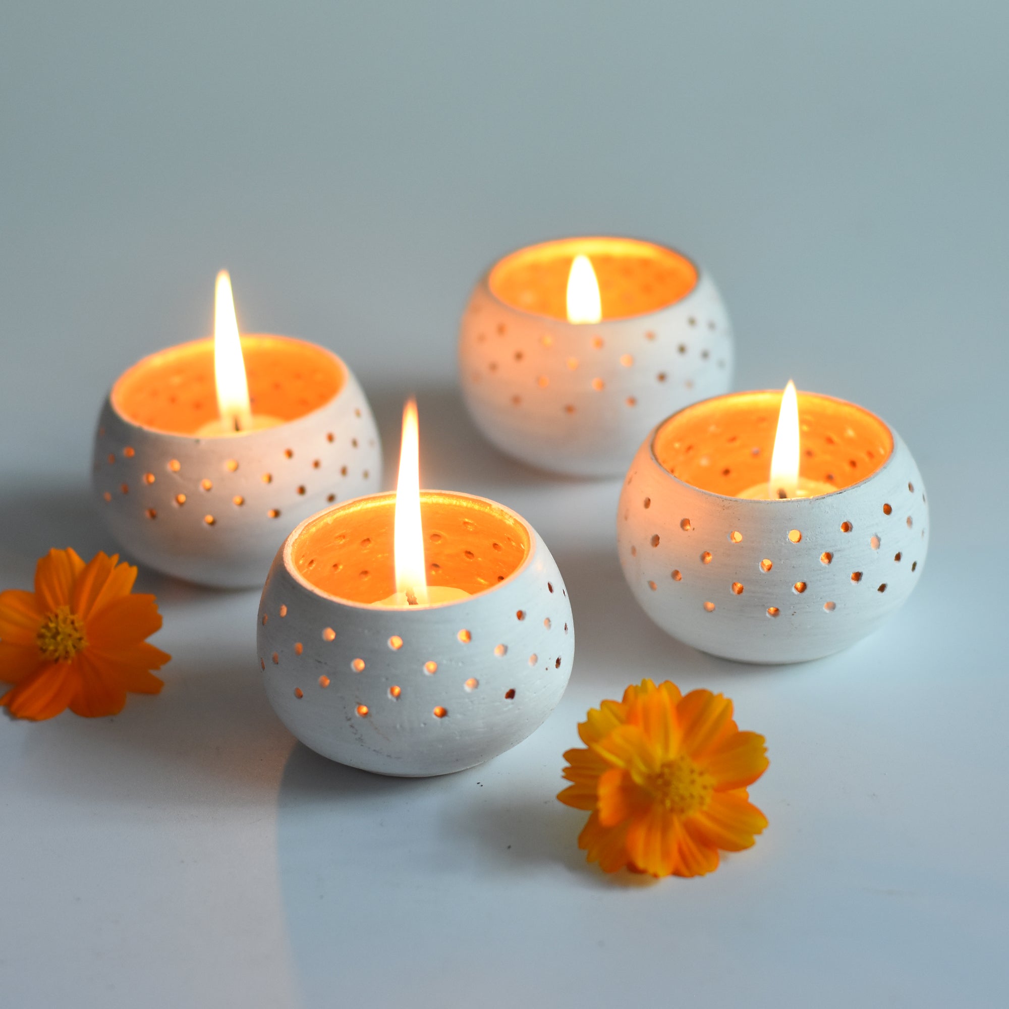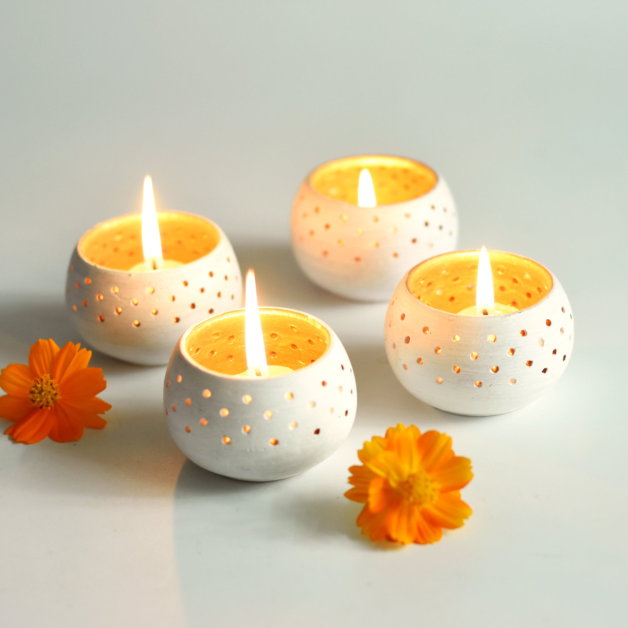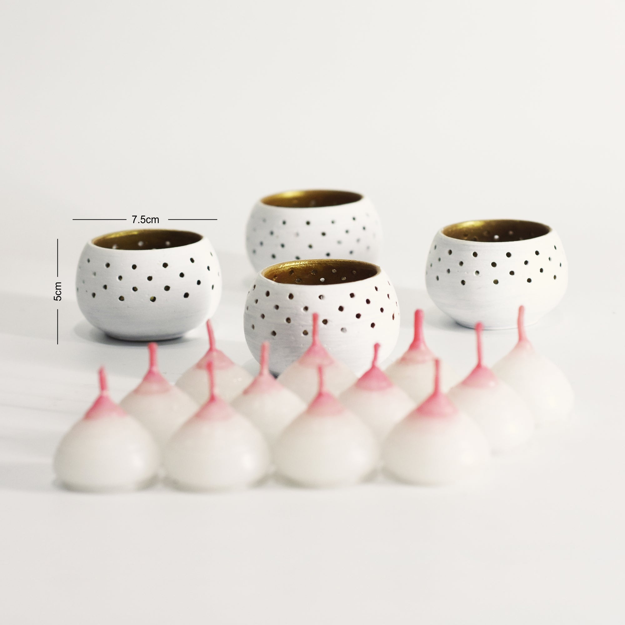Candle Holder "DOME" WHITE - 4 pcs WHITE coloured terracotta clay pots with golden colour inside as reflector of candle lights. An ethnic handcrafted Modernized form of Diya into an beautifully designed Candle Holder. Designs are perfectly handcrafted by village women and young to assure the purest form of delight with the pleasure of Natural Light. Experience the best indoor playful candle light with the modern design of candle holders.