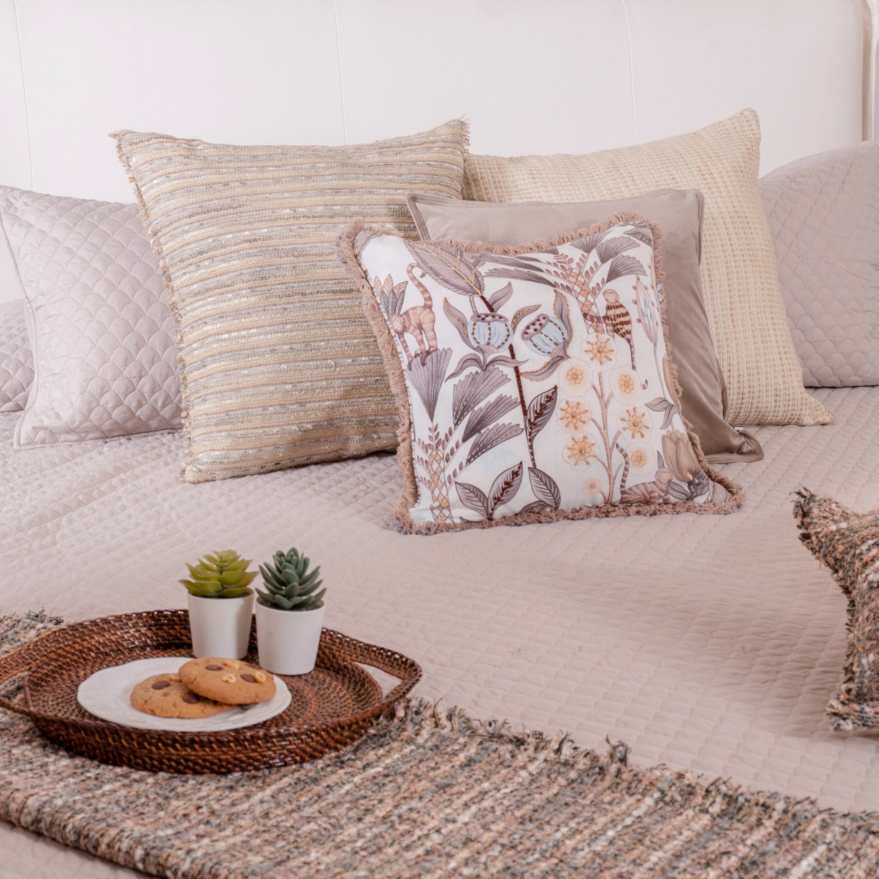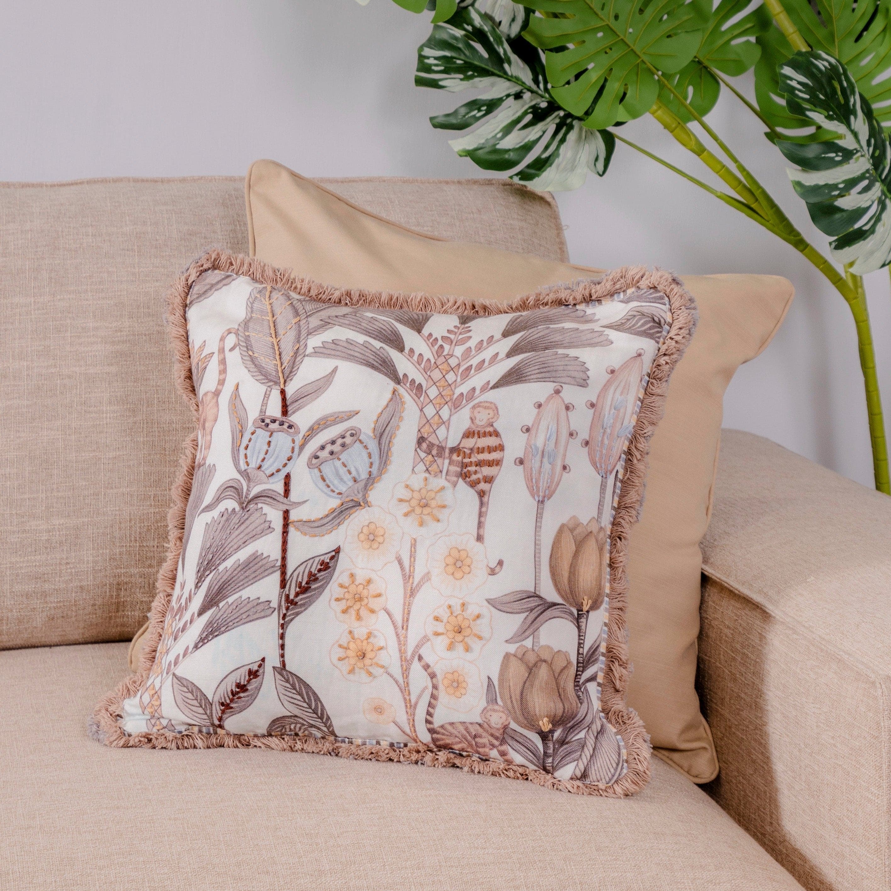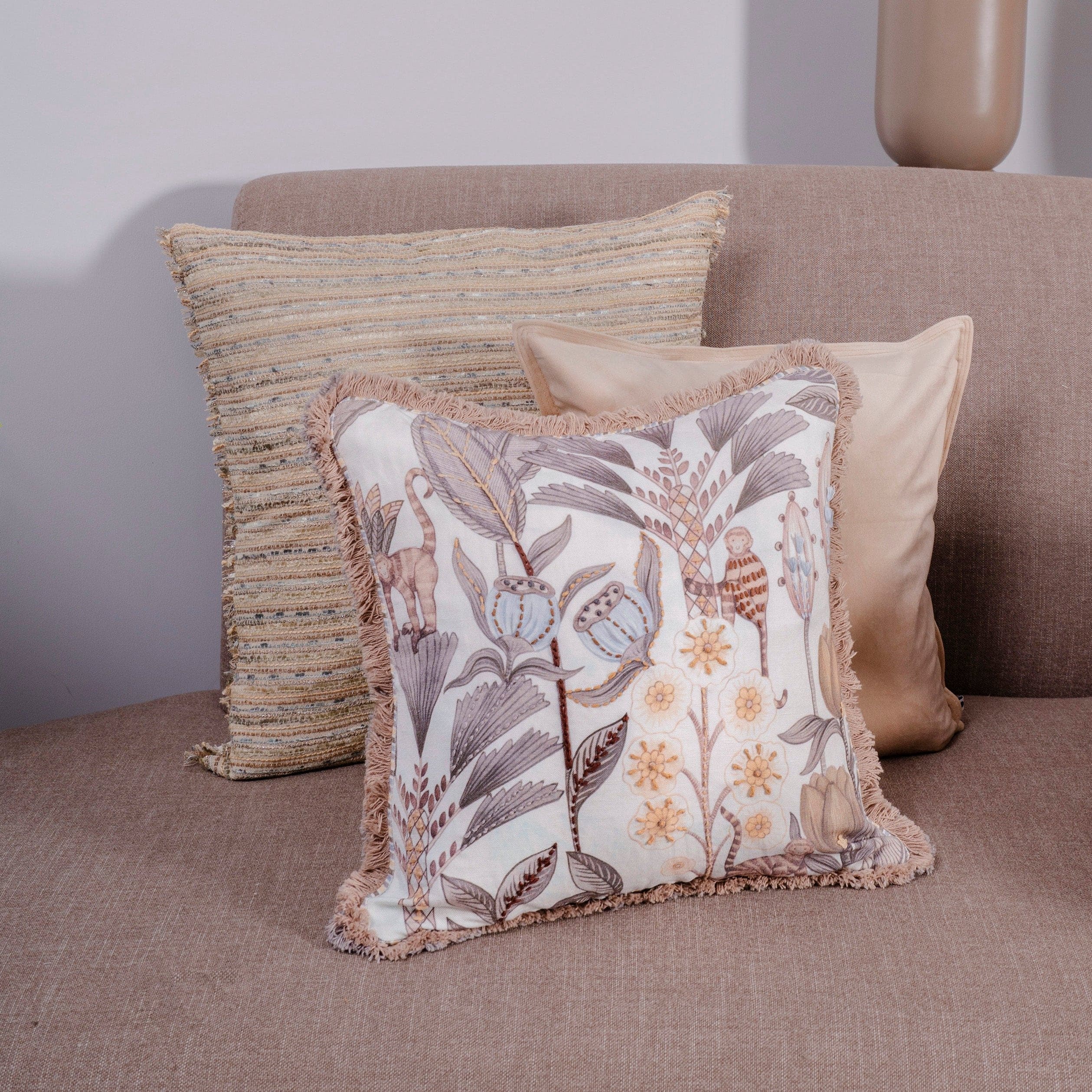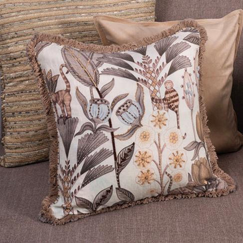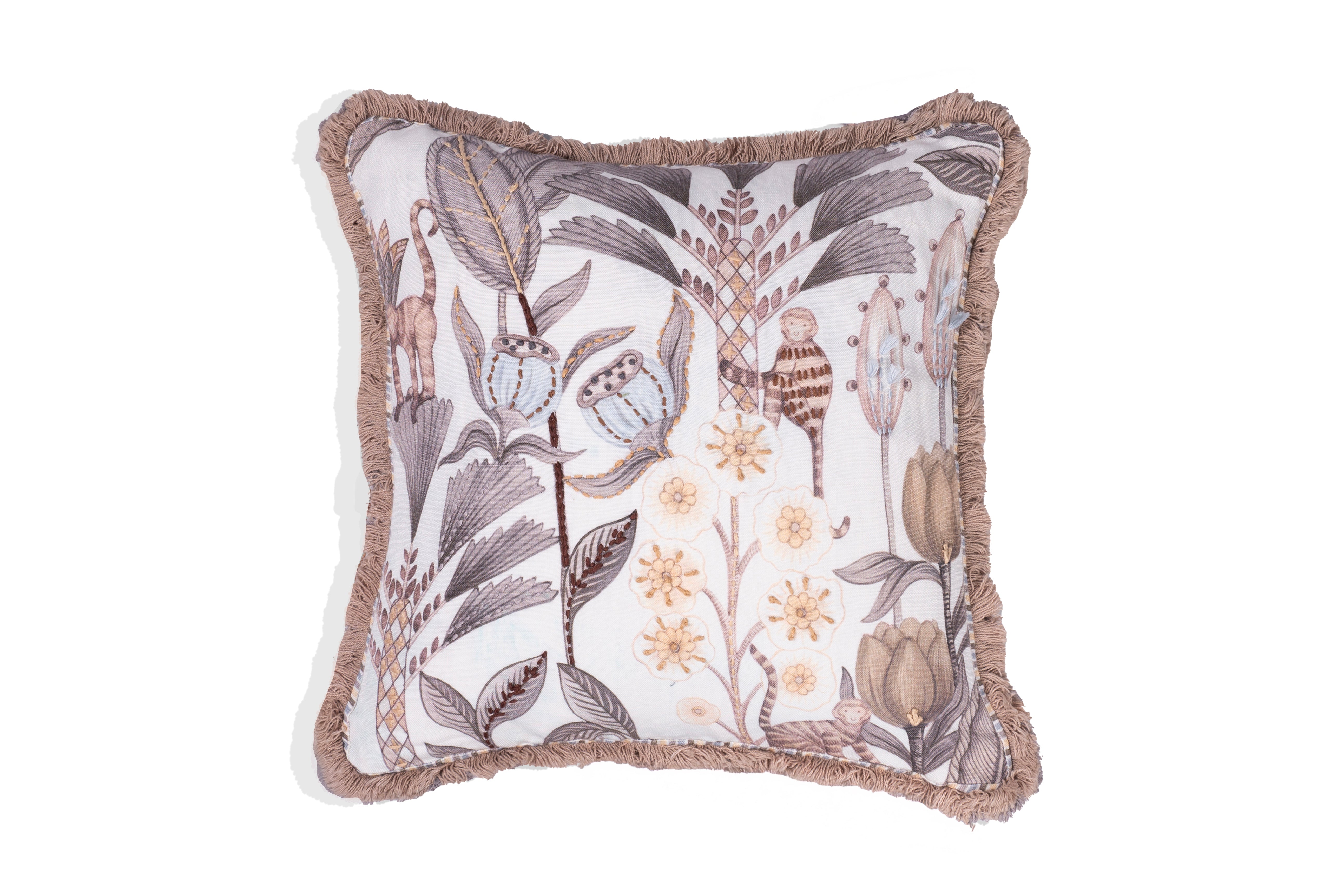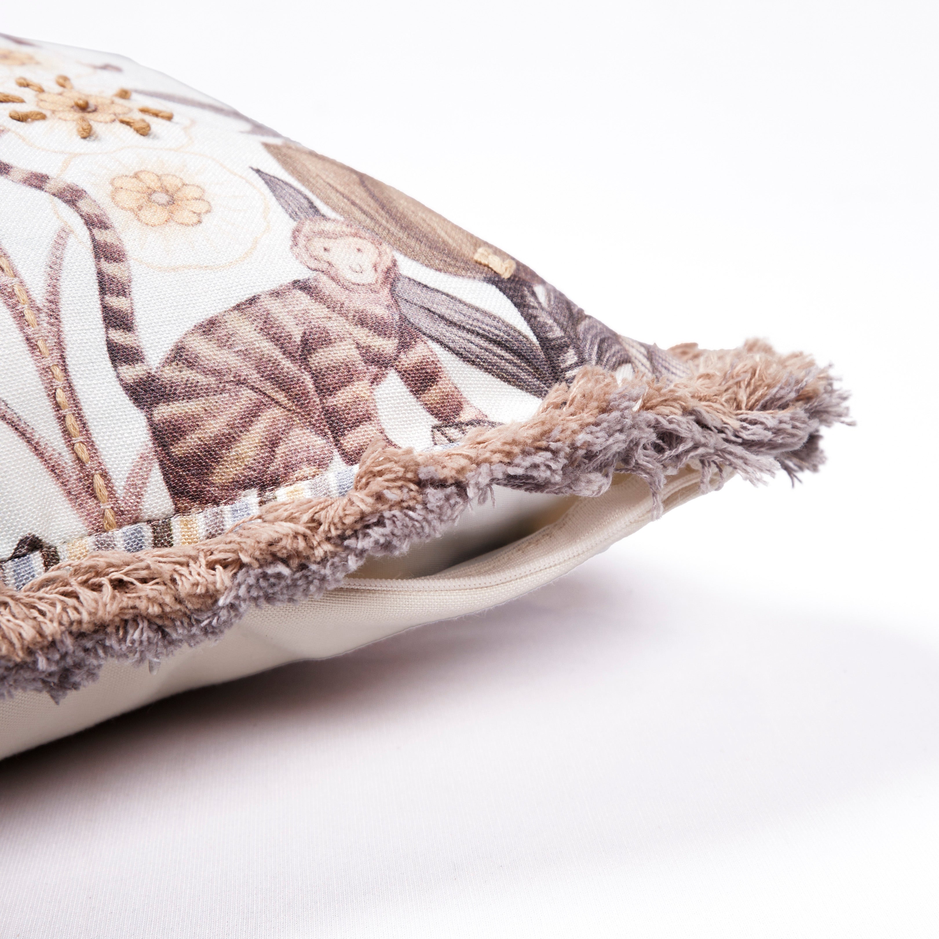 Want to monkey around? Add a dash of whimsy to your space with this vibrant cushion cover, featuring a playful print of lush foliage and playful monkeys. Crafted from a soft linen viscose blend, it’s finished with elegant fringes that lend a touch of texture and flair. Perfect for bringing character and charm to any setting.