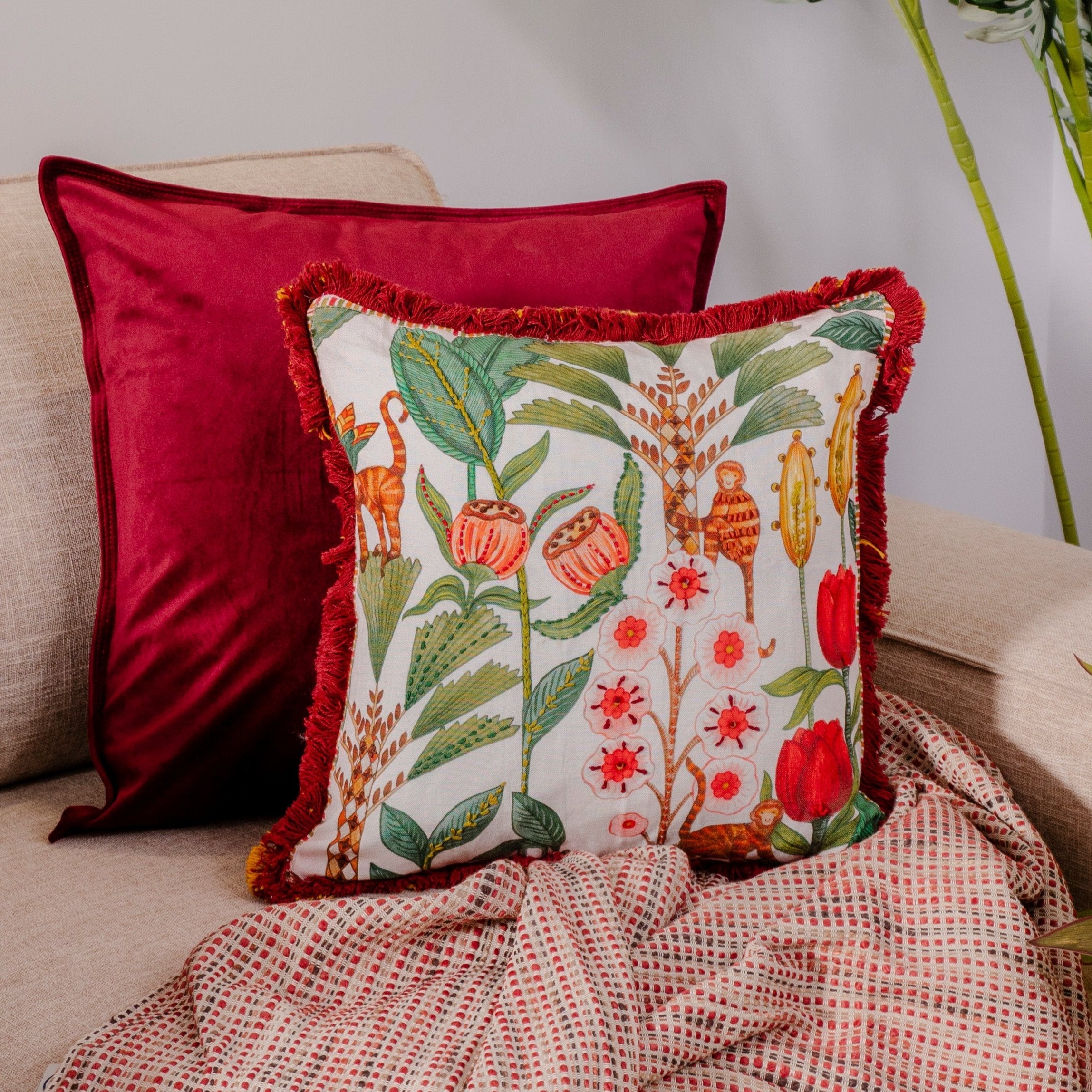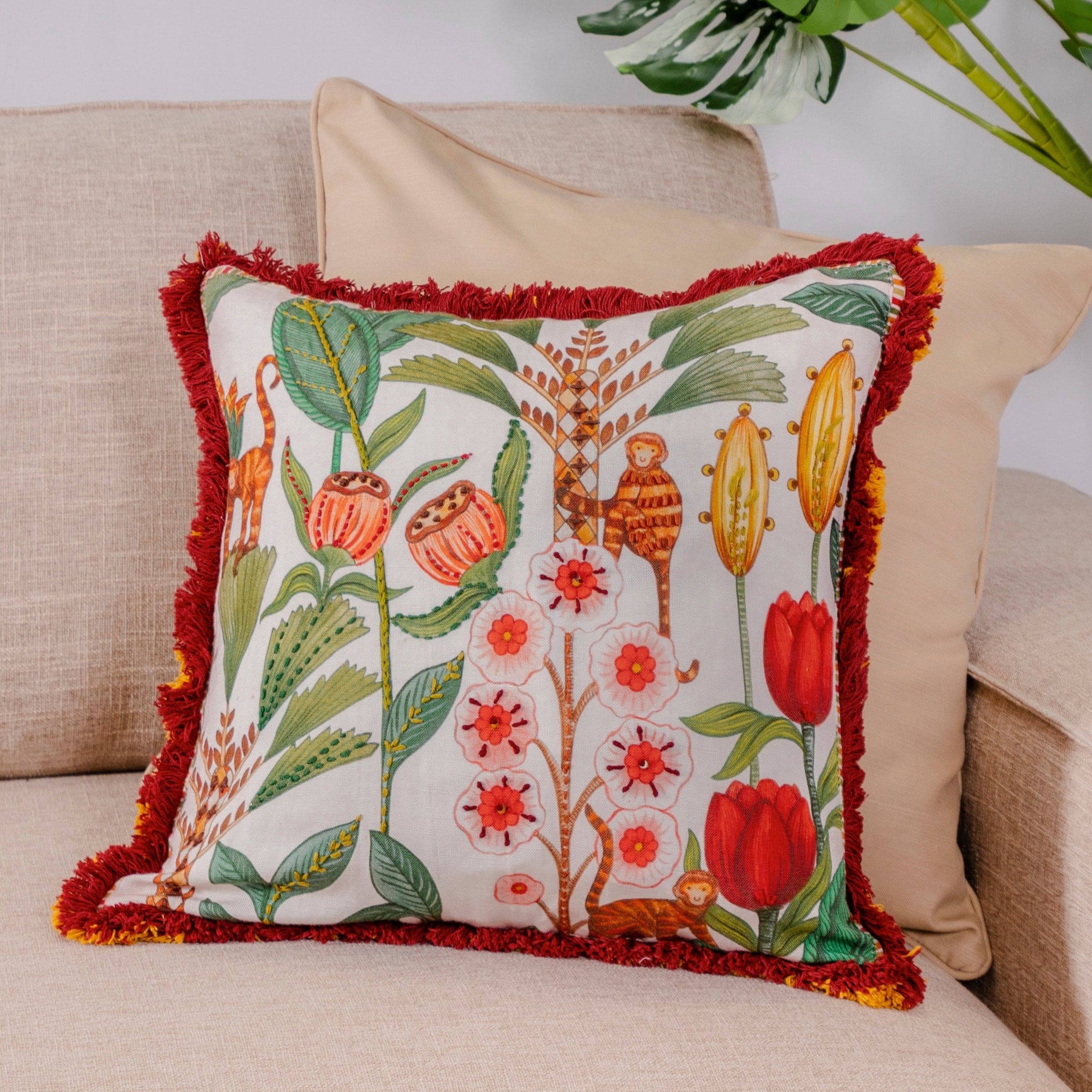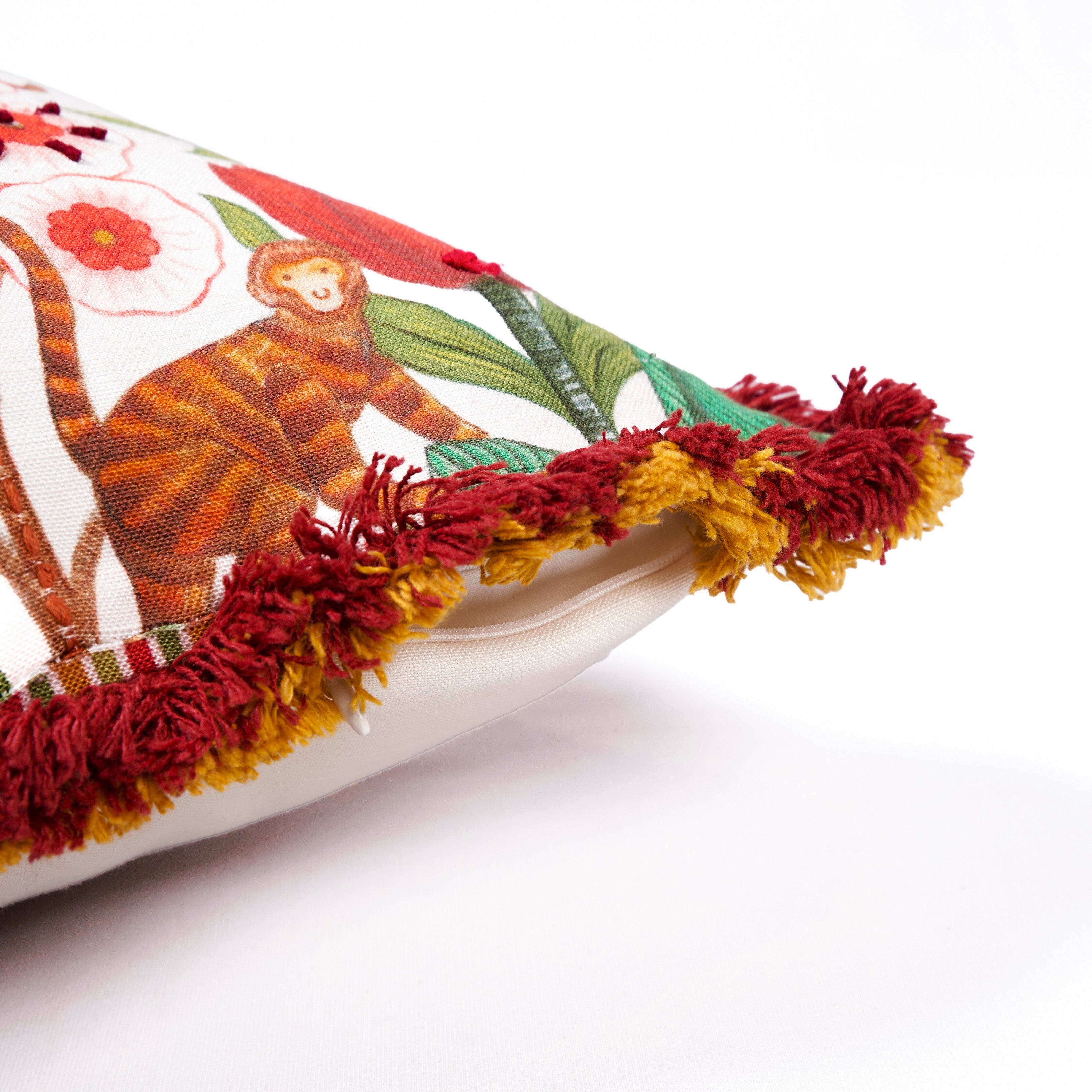 Want to monkey around? Add a dash of whimsy to your space with this vibrant cushion cover, featuring a playful print of lush foliage and playful monkeys. Crafted from a soft linen viscose blend, it’s finished with elegant fringes that lend a touch of texture and flair. Perfect for bringing character and charm to any setting.