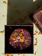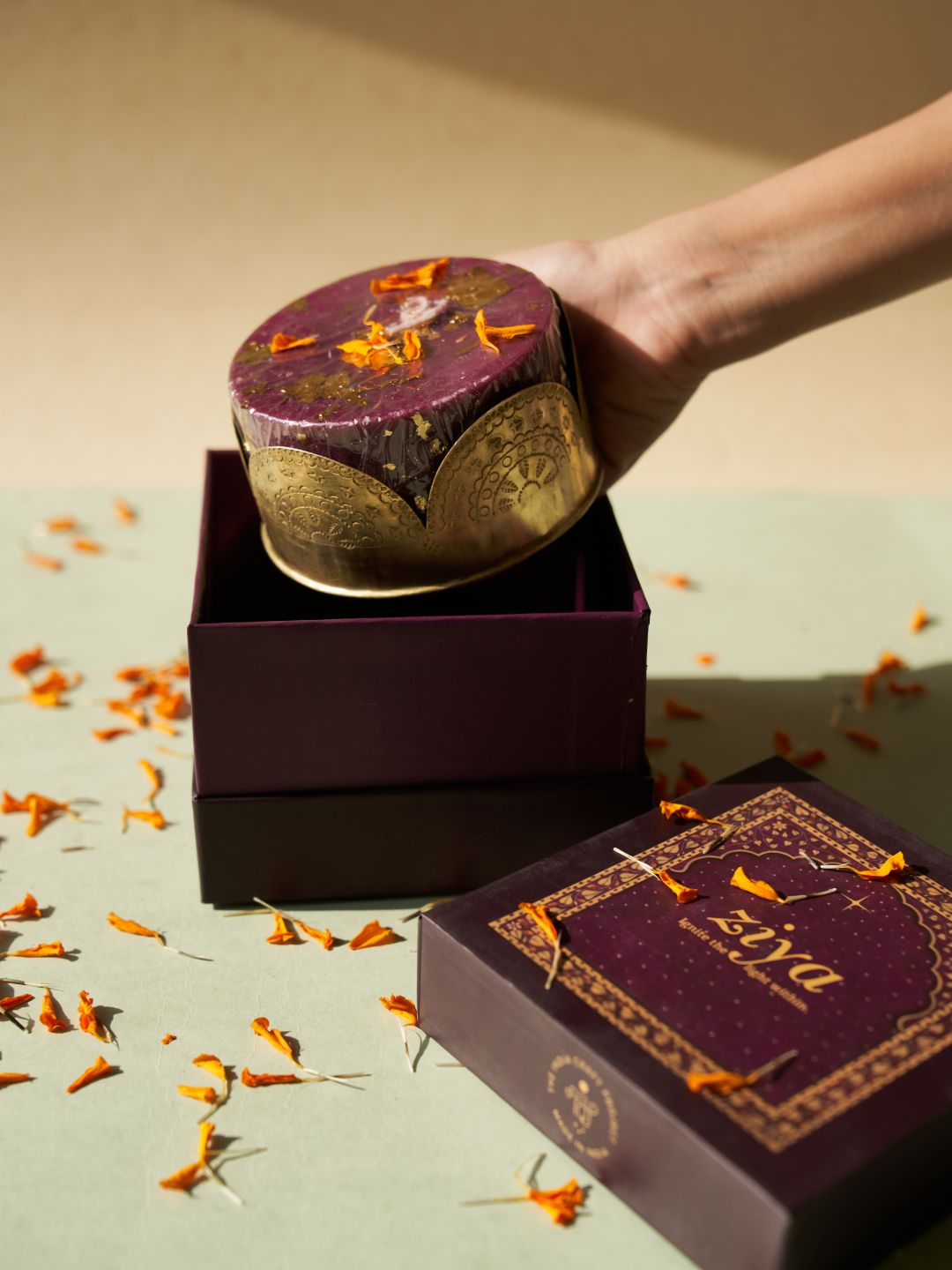 Ziya Scallop Gift Box: Vanilla Homemade Candle with gold foil and Handmade Scallop Shaped Brass Candle Stand