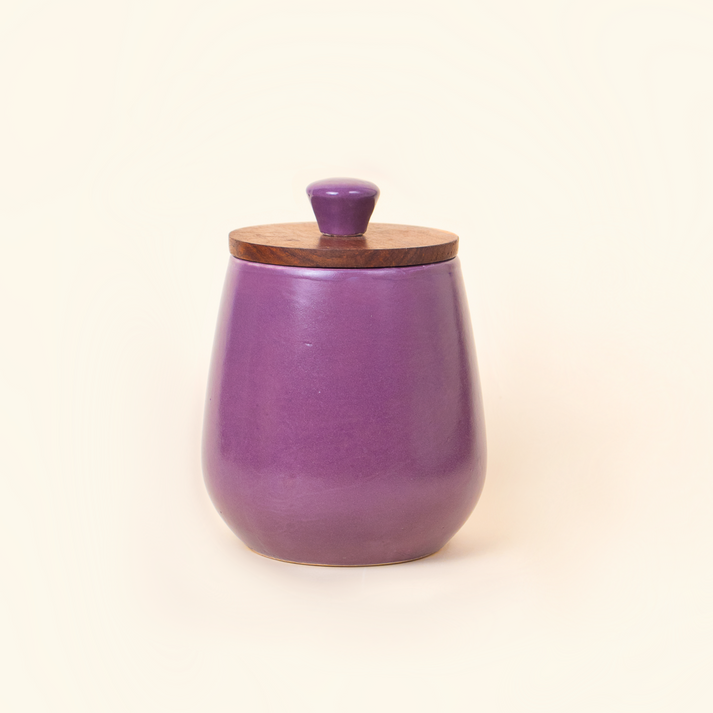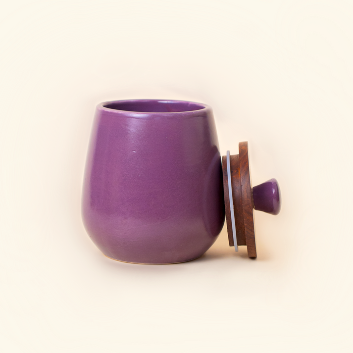 Handcrafted in Stoneware, Ceramics. Labour of love straight from Khurja. The lid is made with Mango wood with a silicone ring around it to make the jar airtight.