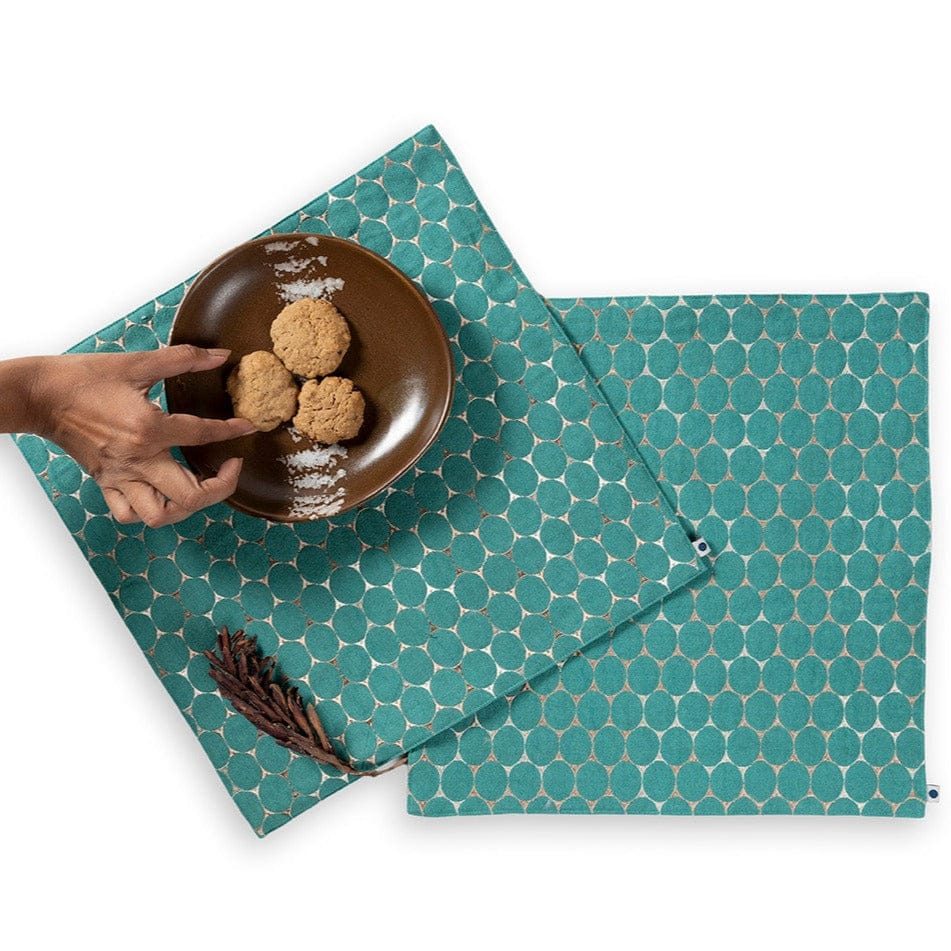 Orderly circular patterns form a chic and evergreen design in an all-turquoise green palette on our Sphere Placemat. Laying the table for a sit-down dinner doesn't have to be a daunting task with this mat! And with a few tweaks to the old formulas, you'll end up with a table that is cool, modern, and thoroughly inviting.