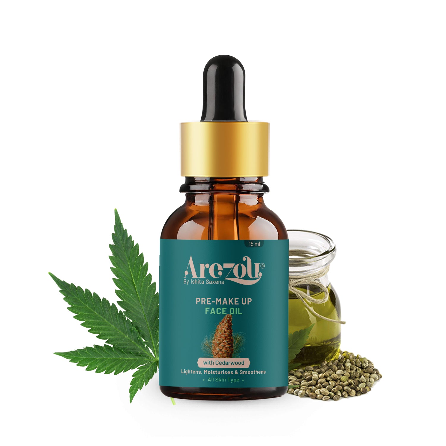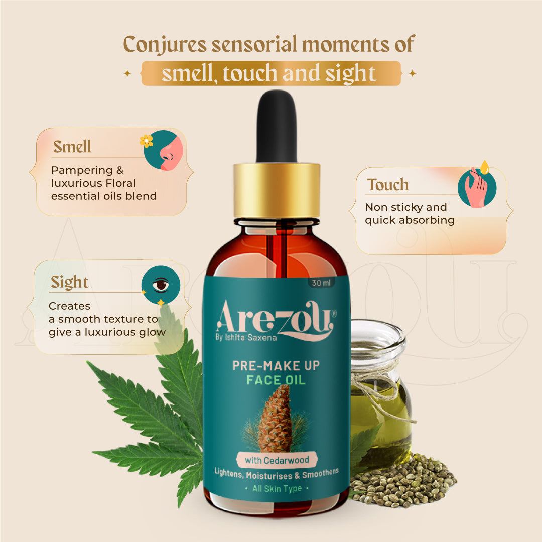 "Arezou’s Pre Makeup Face Oil adds the necessary hydration to your skin before makeup application. It is non greasy and quickly absorbs into the skin. Formulated with 100% natural ingredients such as Hemp seed oil, Jojaba oil and sweet kernel oil, it adds a moisturising effect making ths skin look healthy and supple