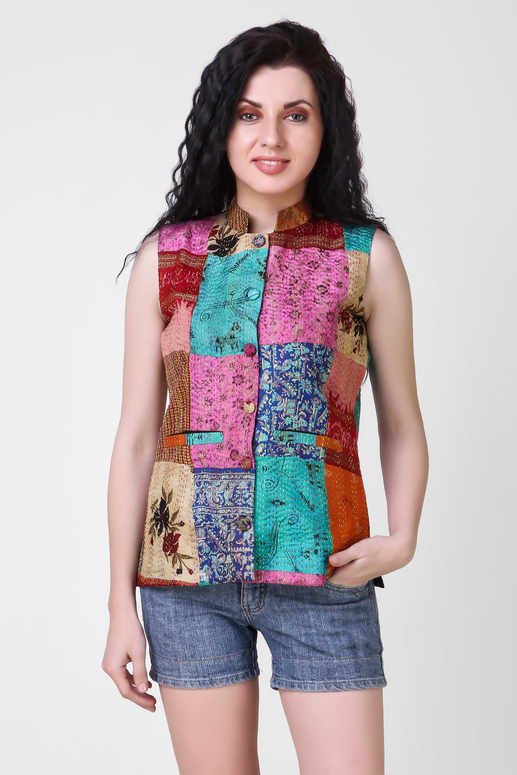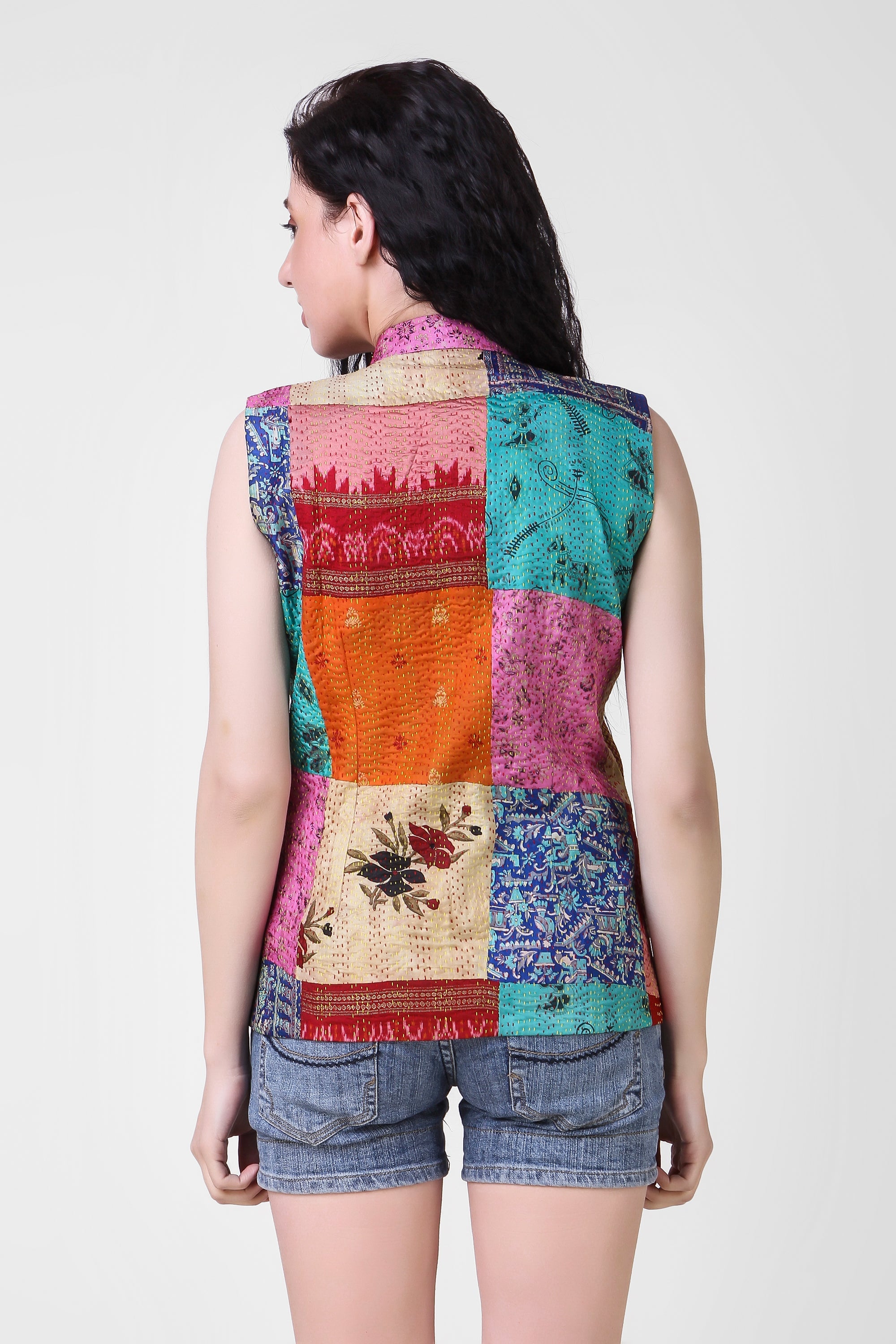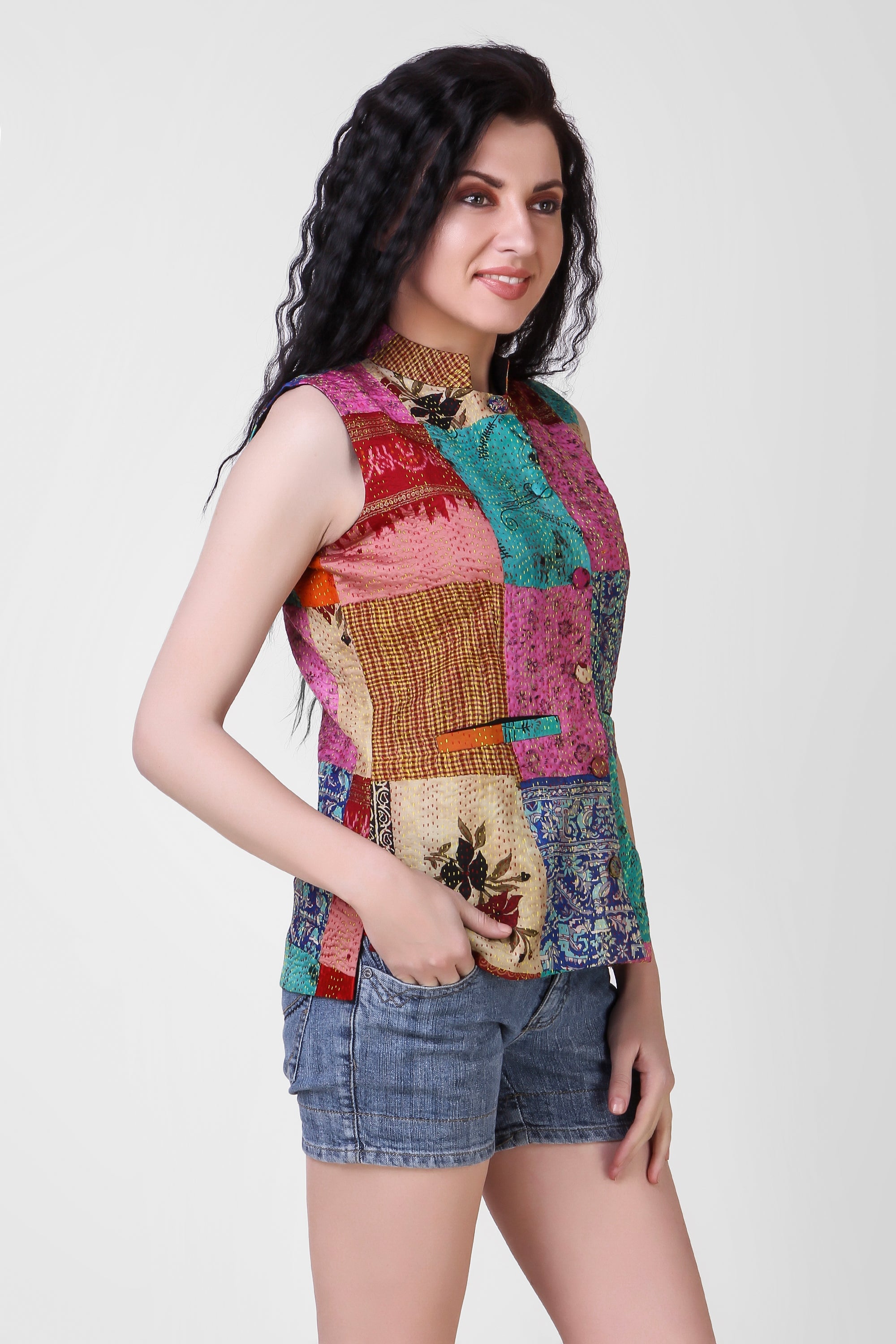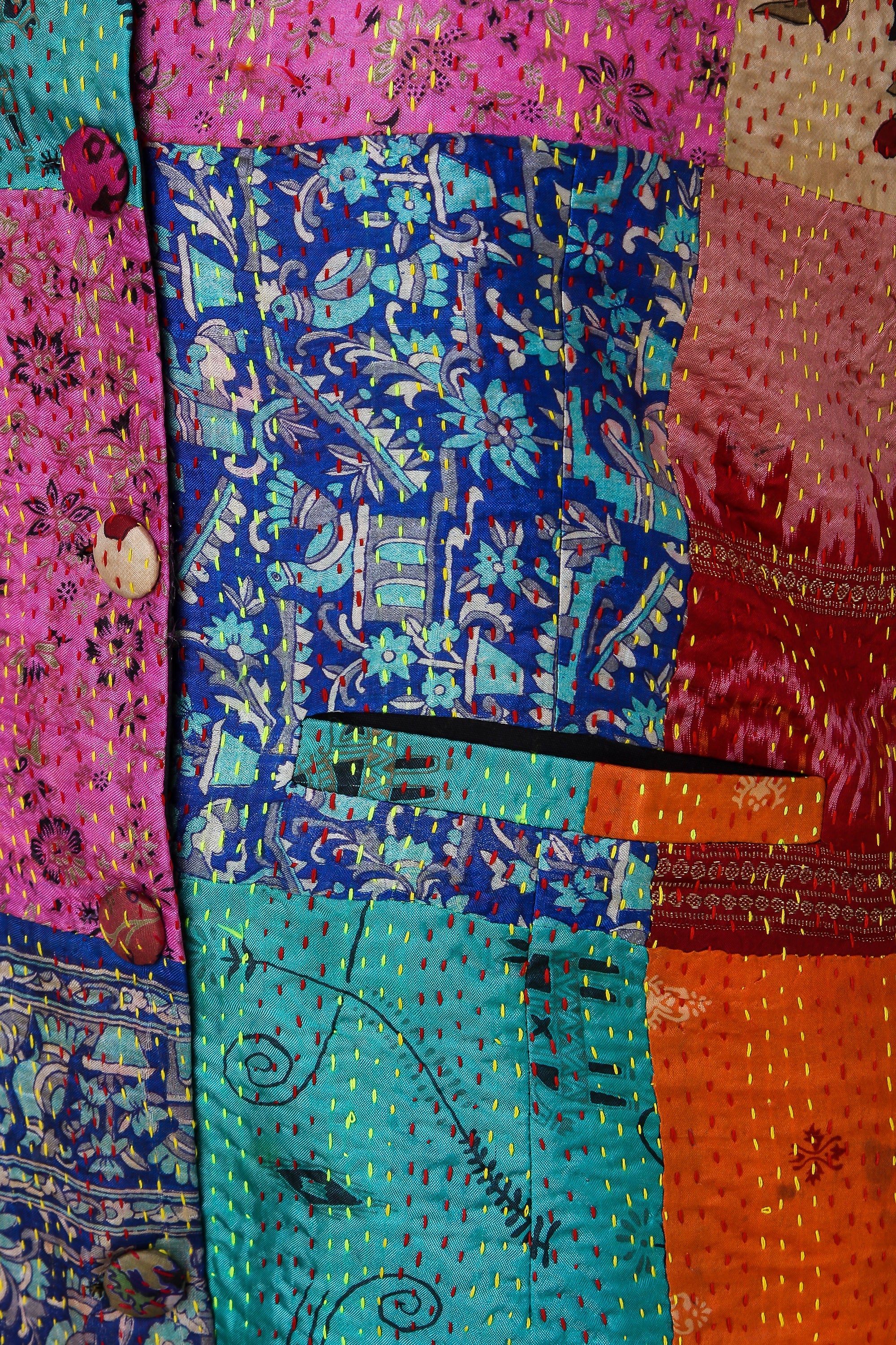 Vintage Silk Kantha Jacket, inspired by the iconic Nehru style. Crafted from luxurious silk and adorned with intricate Kantha stitching, this all-season jacket exudes sophistication and charm.