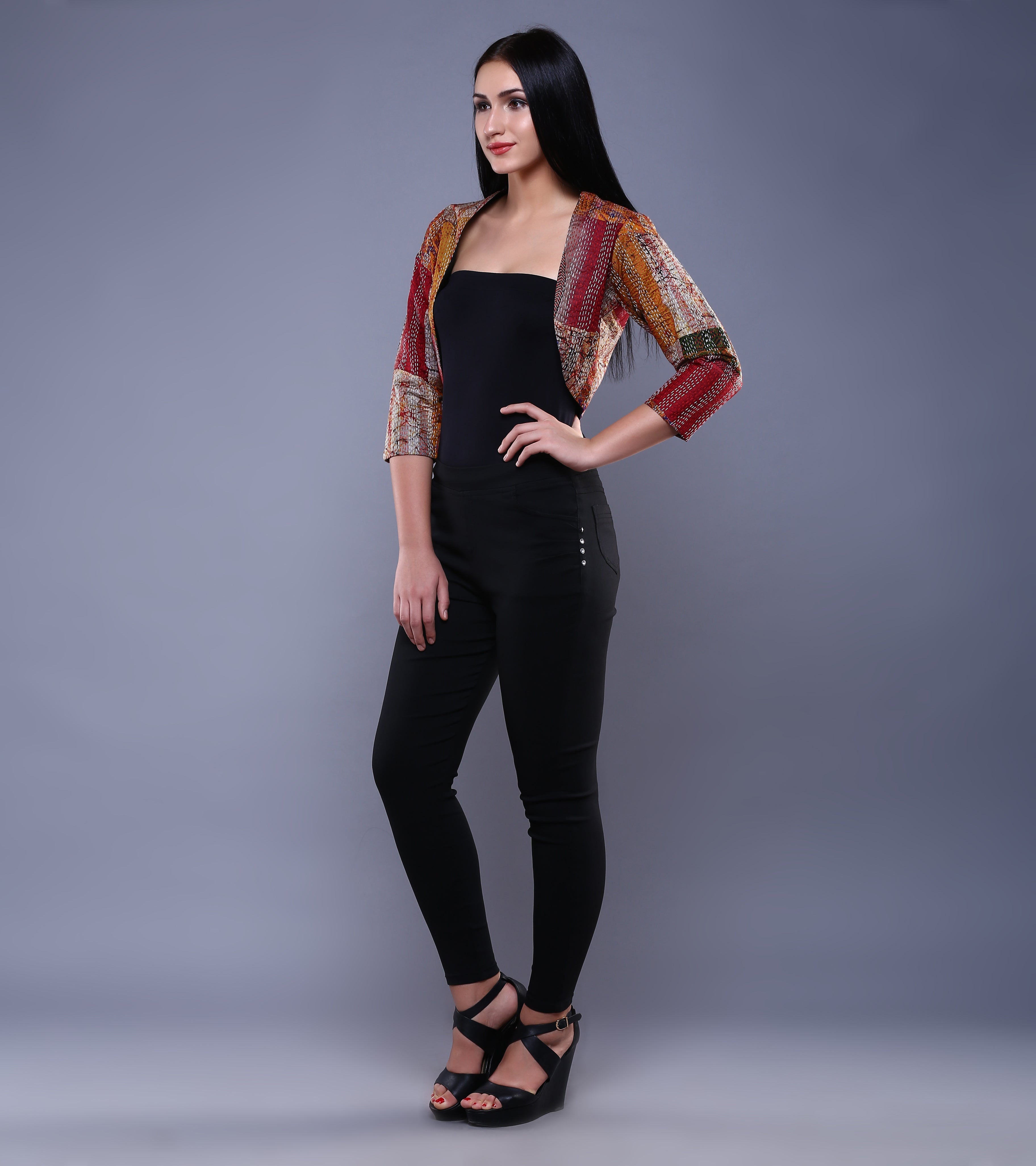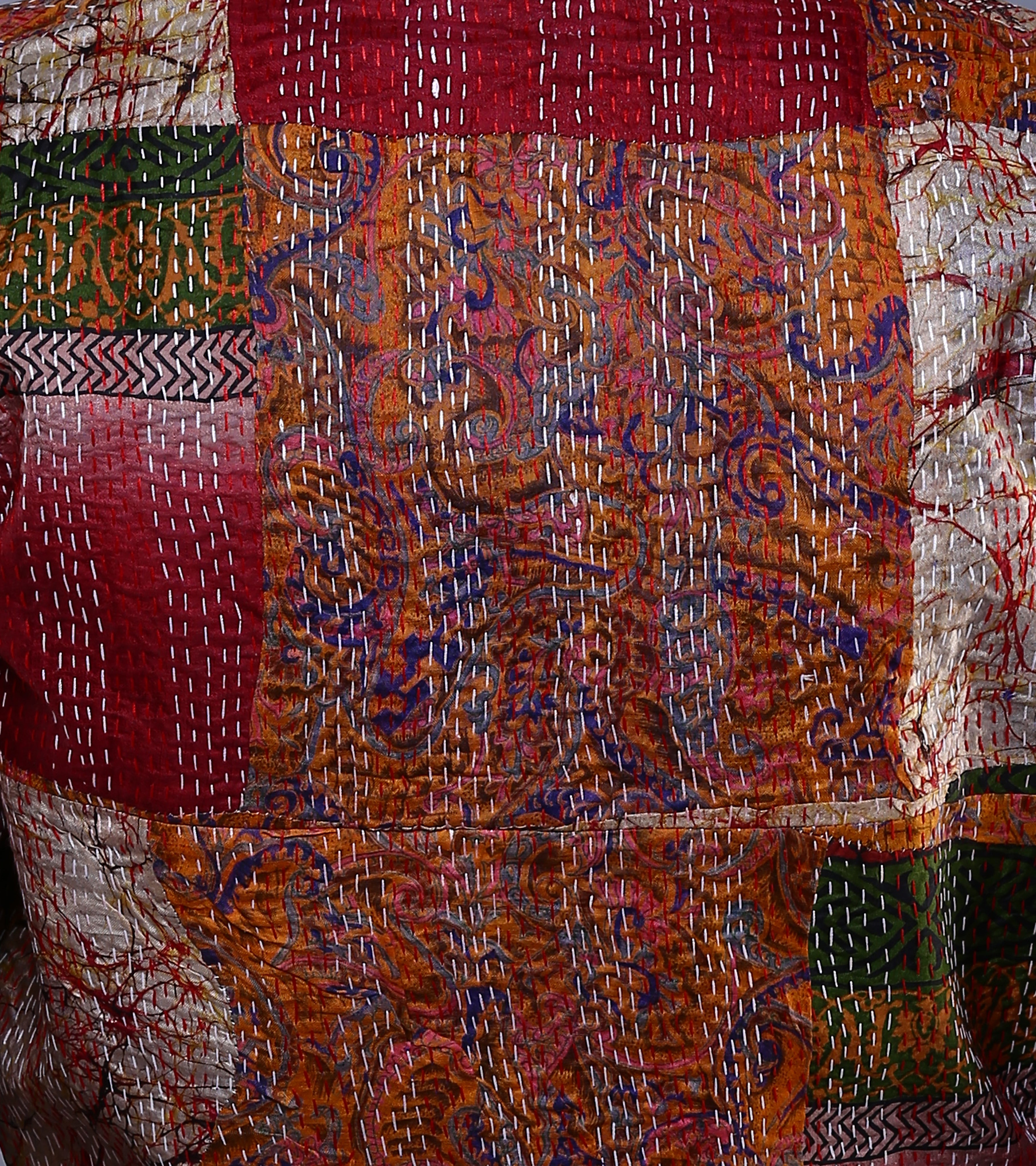Add a touch of elegance to any outfit with this exquisite silk Kantha shrug. Featuring intricate hand embroidery and a versatile design, it seamlessly blends traditional Indian craftsmanship with modern flair.