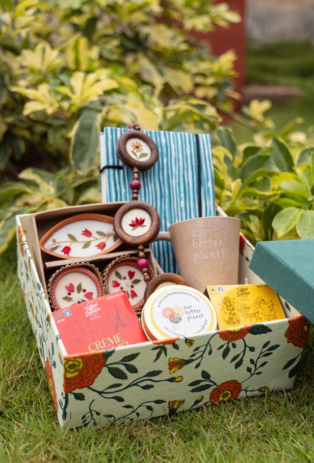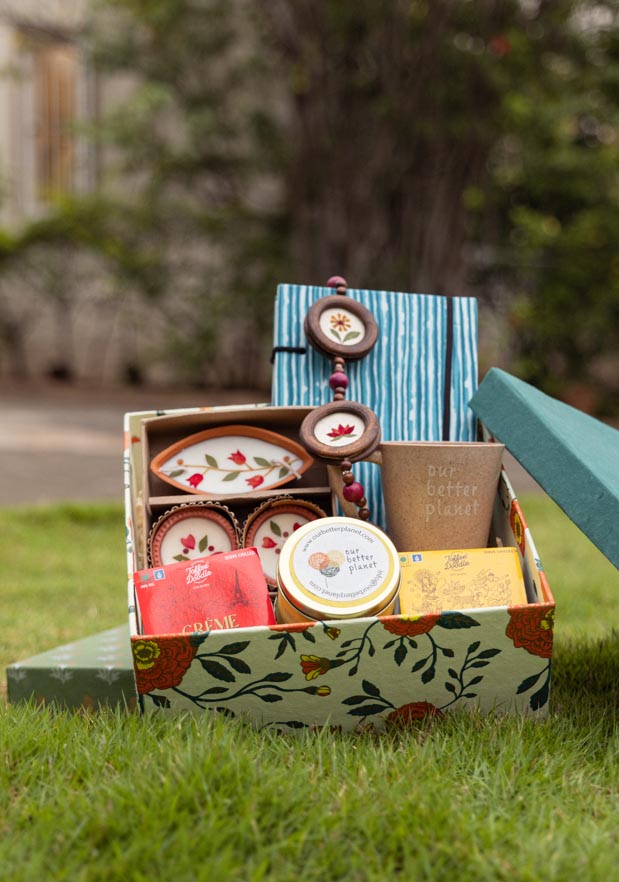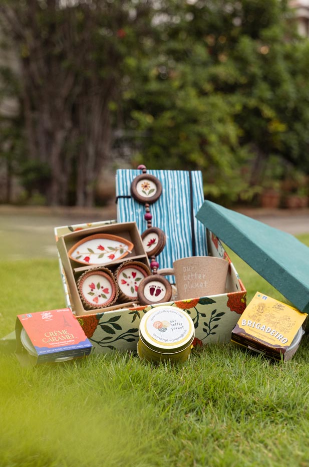 Hamper Contain: Handcrafted Wooden Latkan, Soy Wax Terracotta Diya, Premium Tea Box, Eco-friendly Rice Husk Tea Mug, Recycled Paper Diary and Chocolate-Flavored Pudding