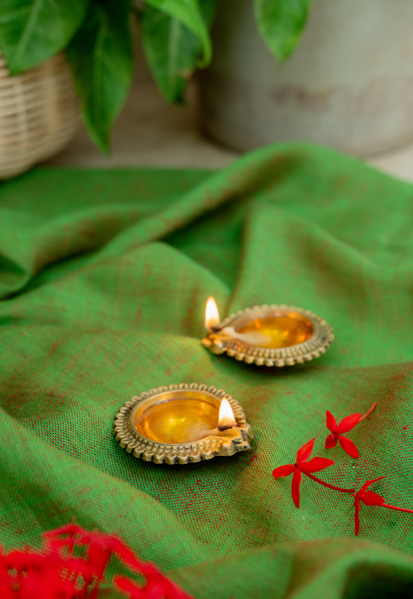 - Set of 2 Brass Diyas — Exquisitely crafted metal diyas that bring elegance and traditional splendour to any space