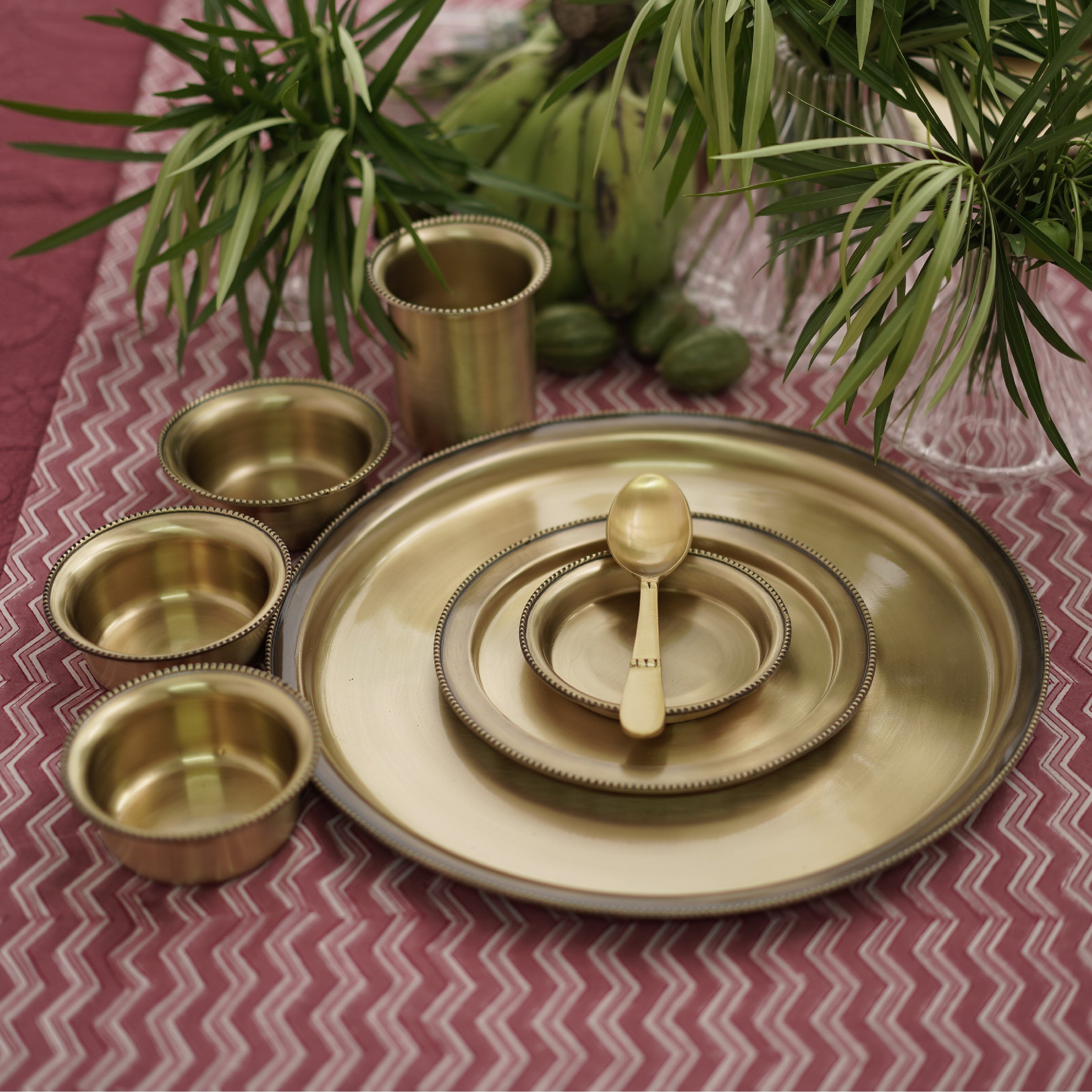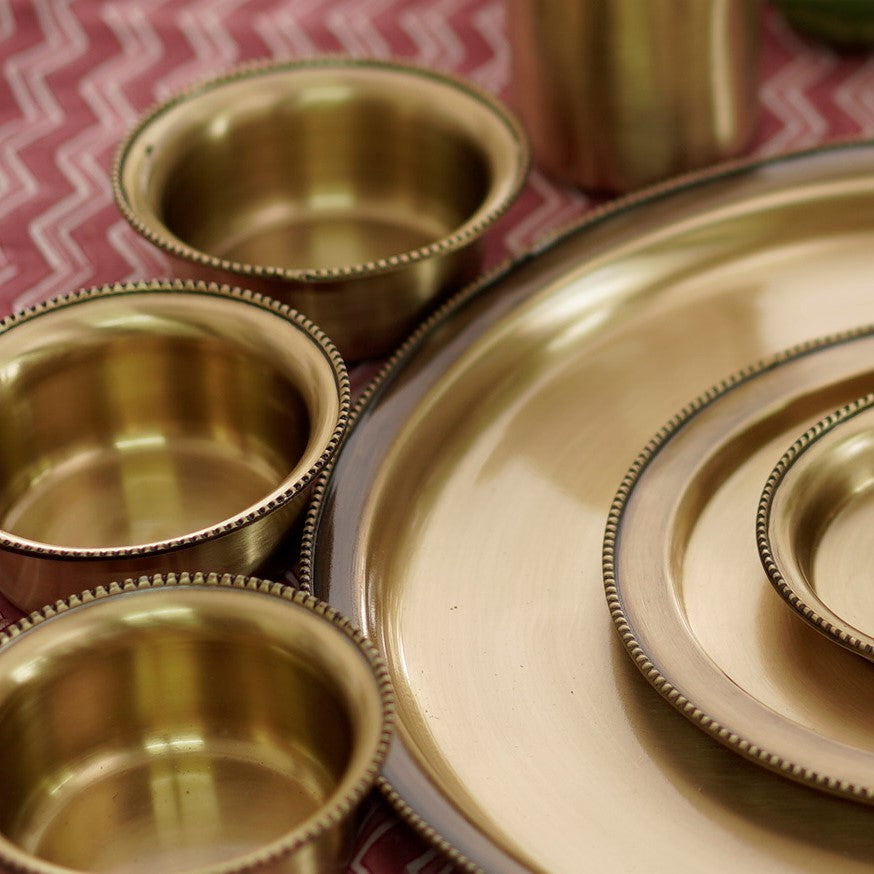The pure brass thalli set accompanied with pure copper jug and glasses and accents of borosilicate glass makes this collection prefect for festive table setting. Enhanced with fine details, delicate attachments and interesting mixed material, the Mangala collection brings class, luxury and Indian ethnic dinnerware and assortments for elegant and royal dining table. Browse for more hidden artifacts for gifting and celebrations.