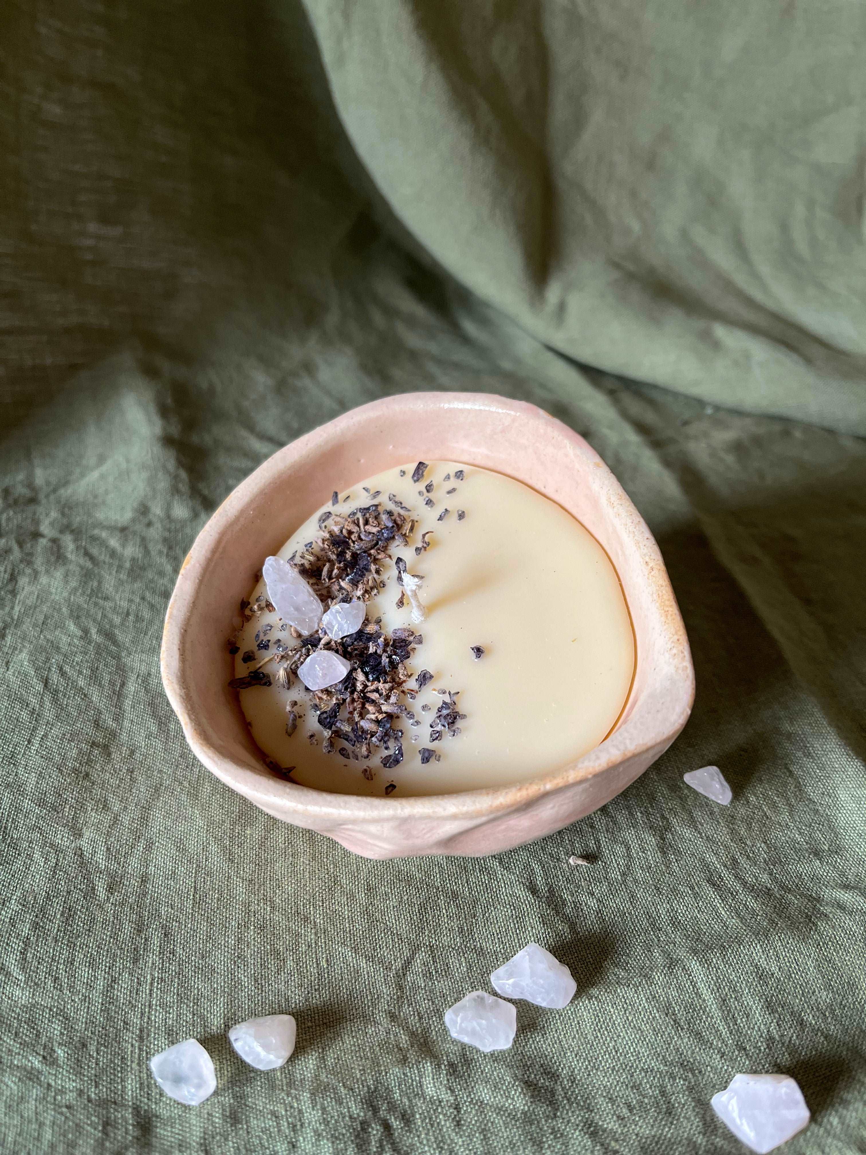 It is made using a handcrafted ceramic jar & natural soy wax topped with beautiful lavender petals and black/ purple stones.