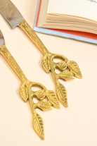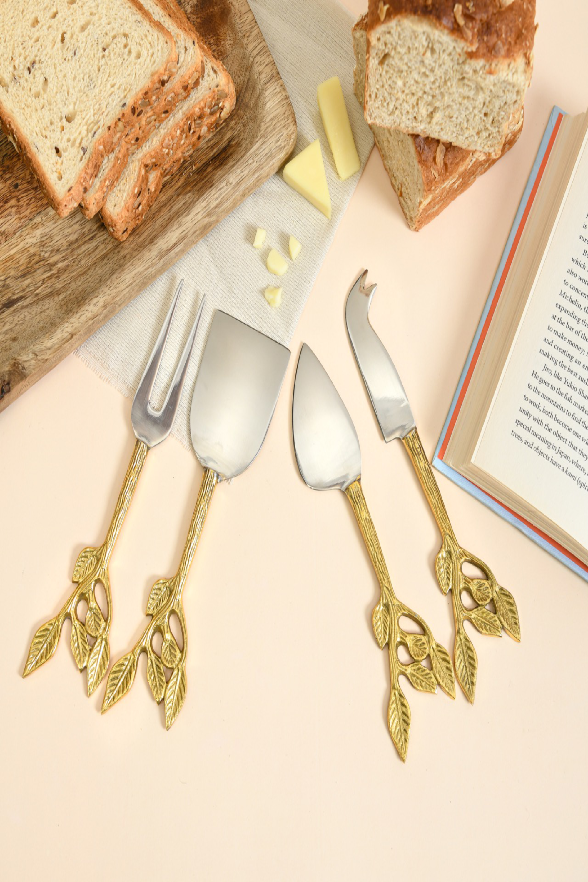 Elevate your cheese platters with the Patram Cheese and Serving Knives set. Crafted from stainless steel and lead-free brass, these knives combine elegance with practicality. The tree-inspired detailing adds a unique charm to your table setting.