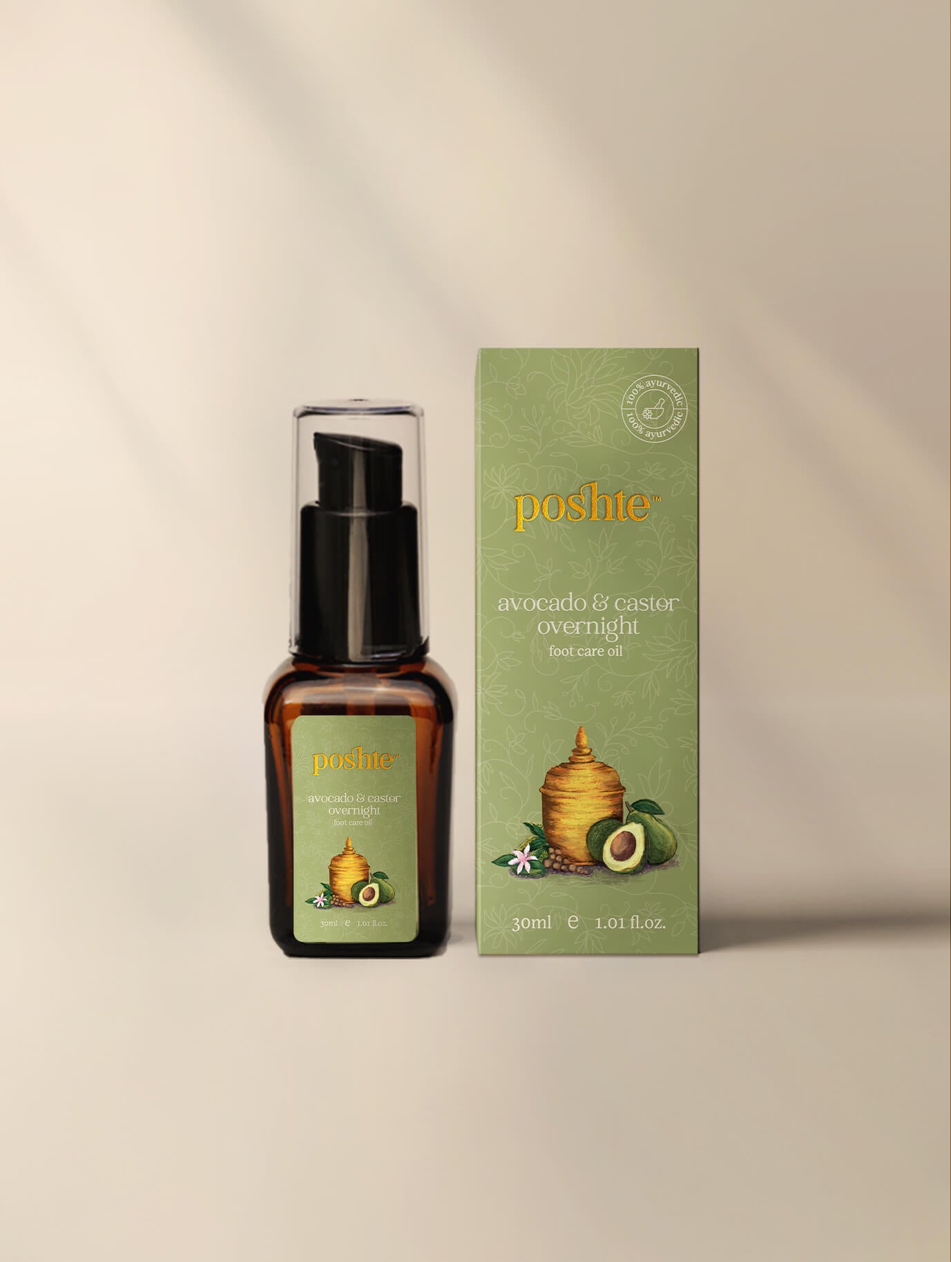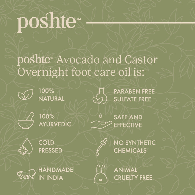 Our Avocado and Castor Overnight foot care oil is a restorative ayurvedic oil blend of castor, avocado, sesame, and hemp seed oil along with Kashmiri lavender and patchouli essential oil. This nourishing blend is ideal for your thirsting feet which are often overlooked. Feel the instant hydration and rejuvenation as you massage your feet with this blend. Regular usage also fosters healing of dull, cracked and damaged heels. Embrace happy with our foot well-being oil.