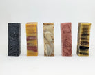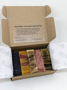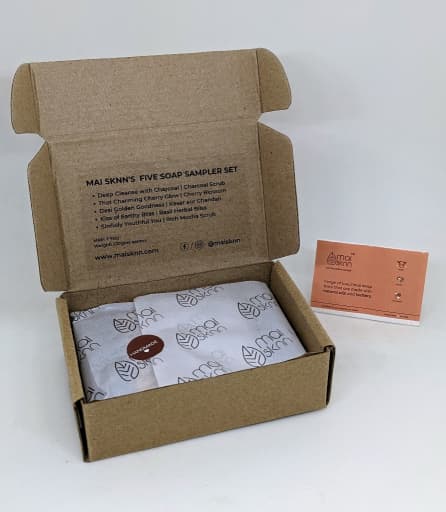 Set of 5 Sample Soaps that have a very mild fragrance. The Sample Soaps in the box are: Charcoal Scrub Soap Kesar aur Chandan Soap Rich Mocha Scrub Soap Cherry Blossom Soap Basil Herbal Bliss Soap Each soap sample is approximately between 40-50gms.