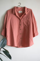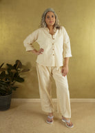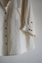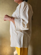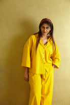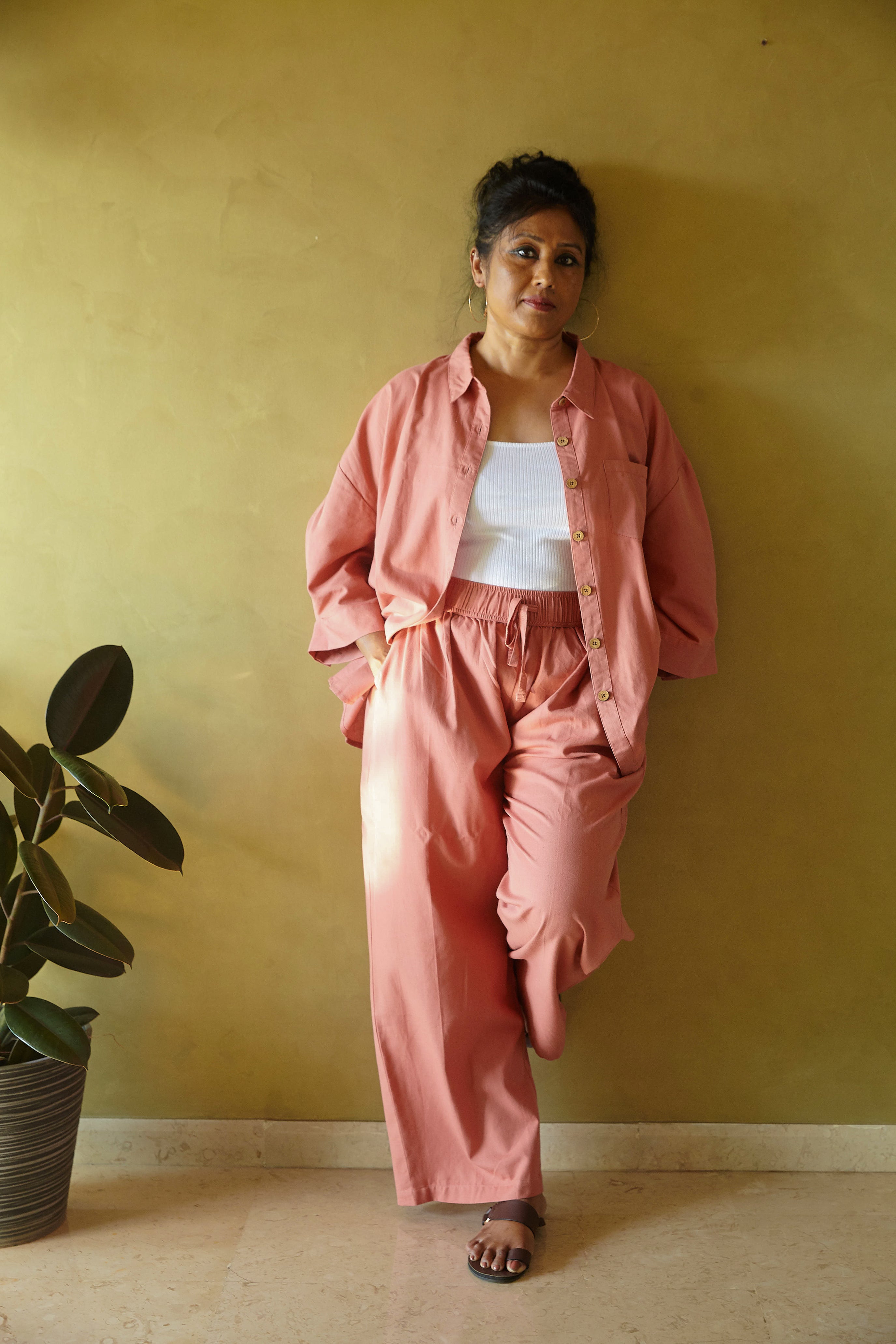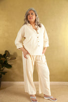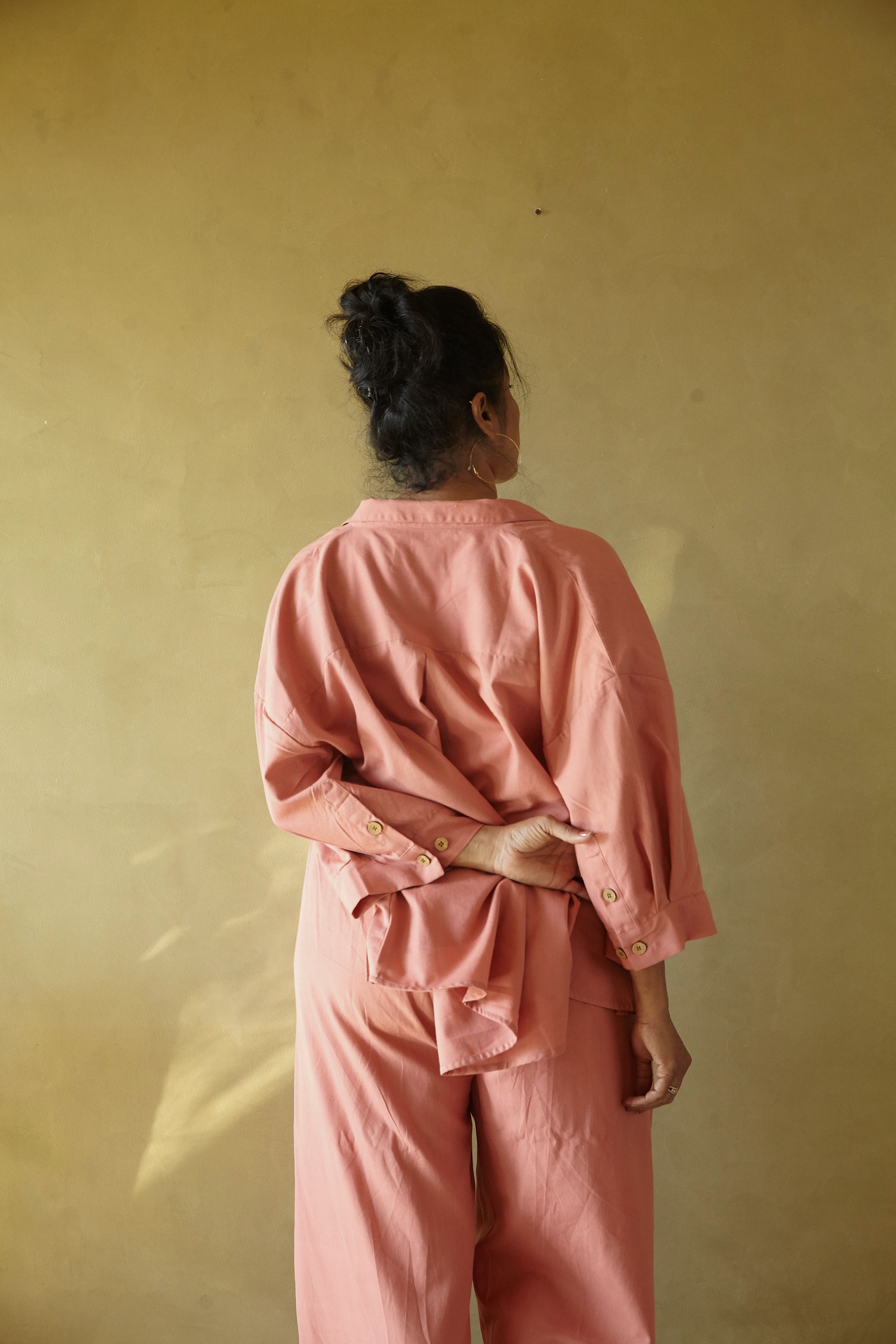Oversized plain cotton Lounge shirt with classic collar and front closure of coconut shell buttons. Drop shoulder sleeves with pleated cuff details.