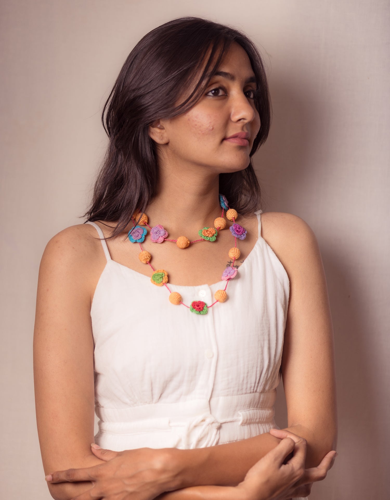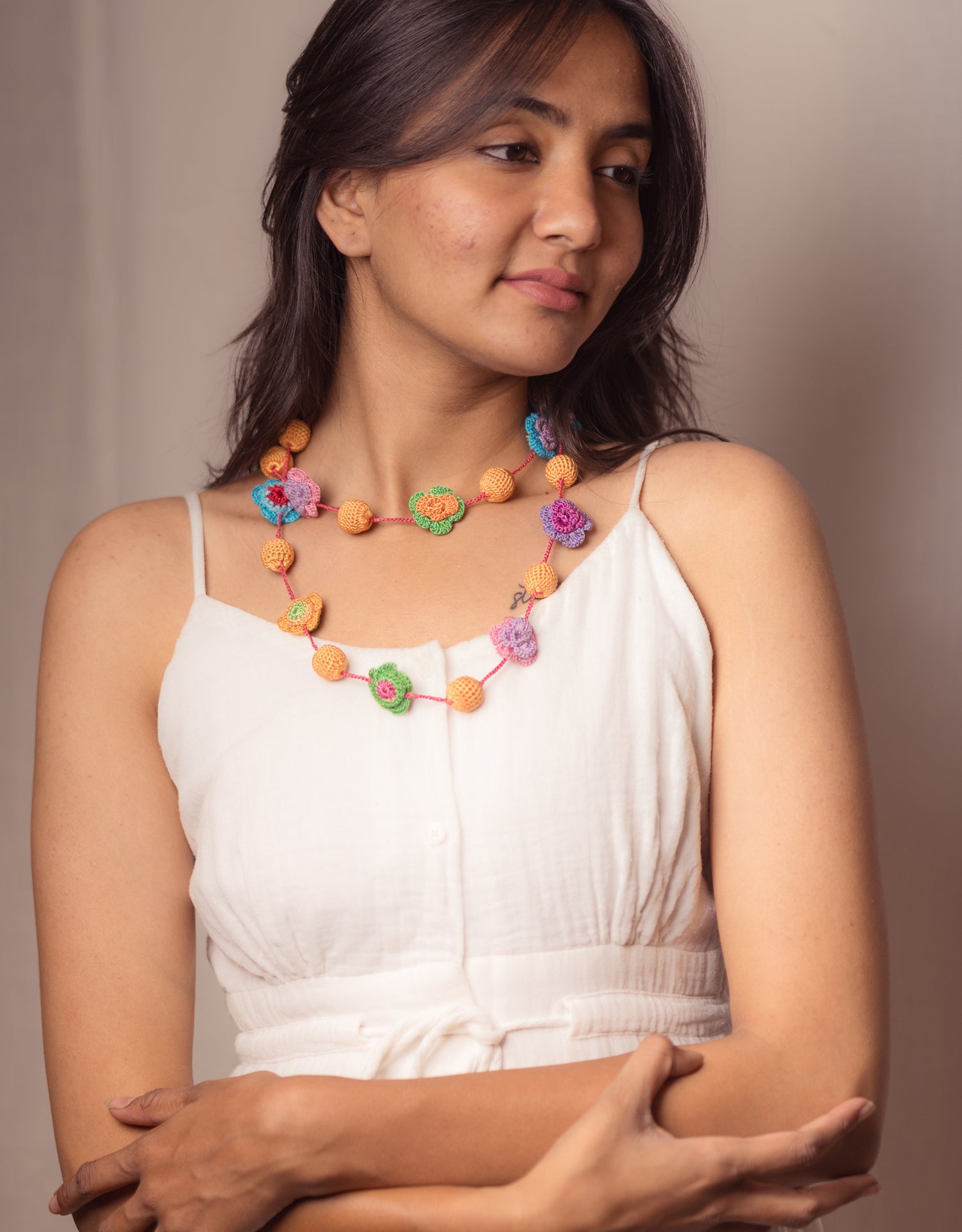 Hand-crocheted flowers in vivid shades bloom alongside golden yellow beads, strung together with a playful pink thread that ties it all together. Bright yet balanced, this piece brings an instant smile and pairs beautifully with solid dresses, ethnic tunics, or even a casual tee-and-jeans combo. Crafted by skilled women artisans, this necklace is a tribute to joyful craftsmanship and timeless charm.