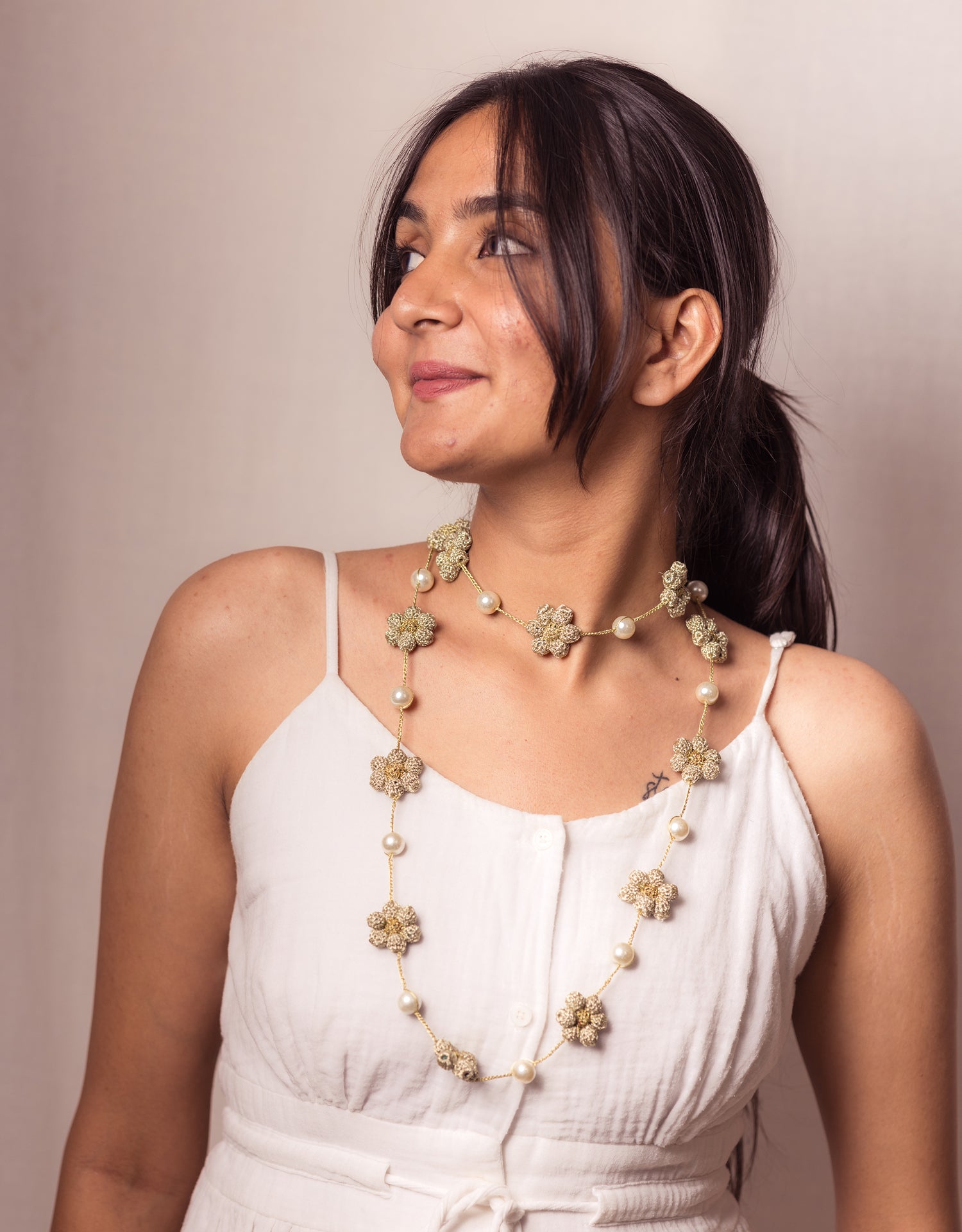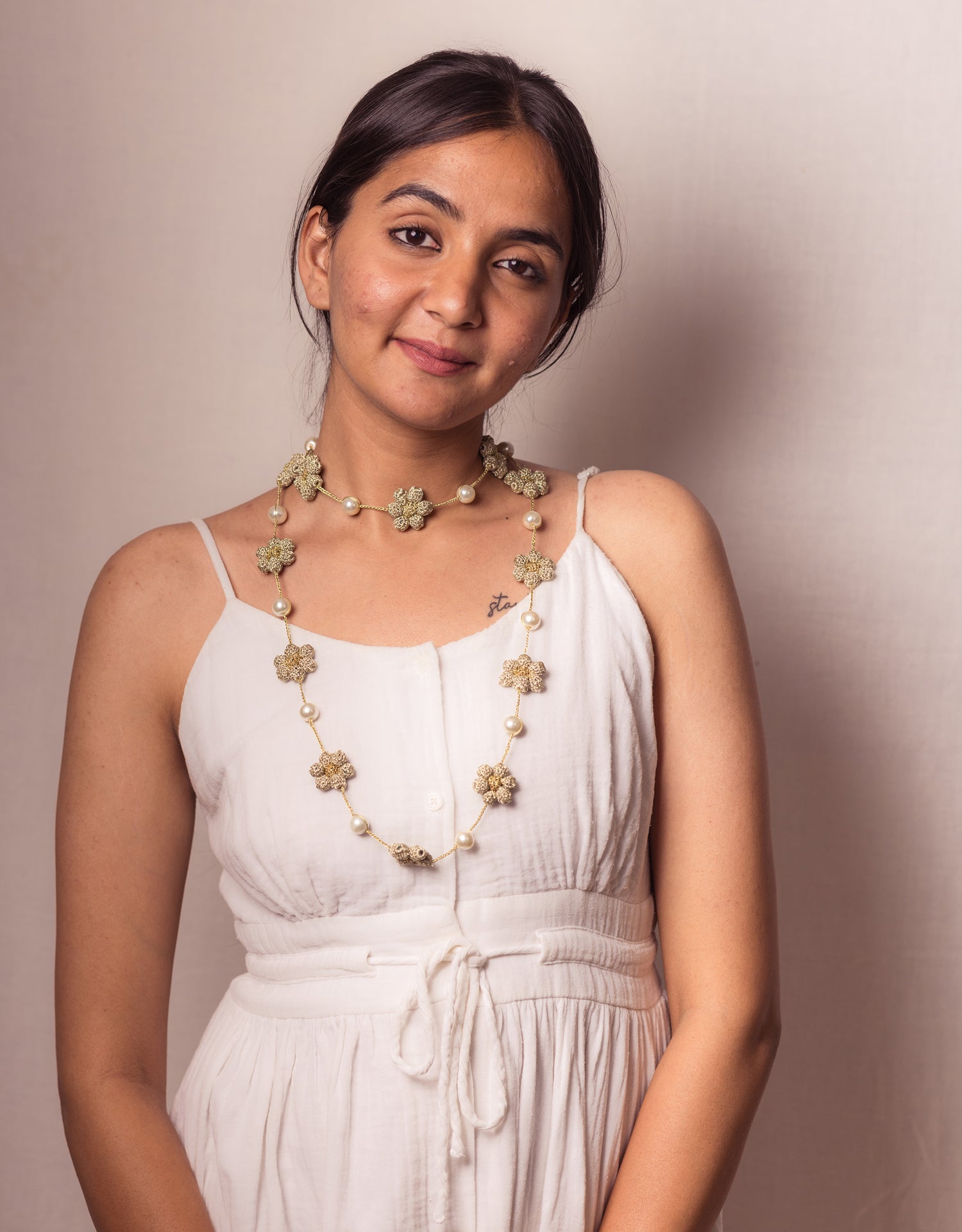 Classic, graceful, and effortlessly sophisticated — this floral necklace redefines elegance with its soft gold tones and pearl detailing. Perfect for weddings, celebrations, or a refined everyday look, this necklace is lightweight yet makes a lasting impression. Whether layered or worn solo, it complements both ethnic ensembles and modern silhouettes with ease. Lovingly handmade by women artisans, it’s a testament to slow fashion, artistry, and the power of traditional craft in a contemporary world.