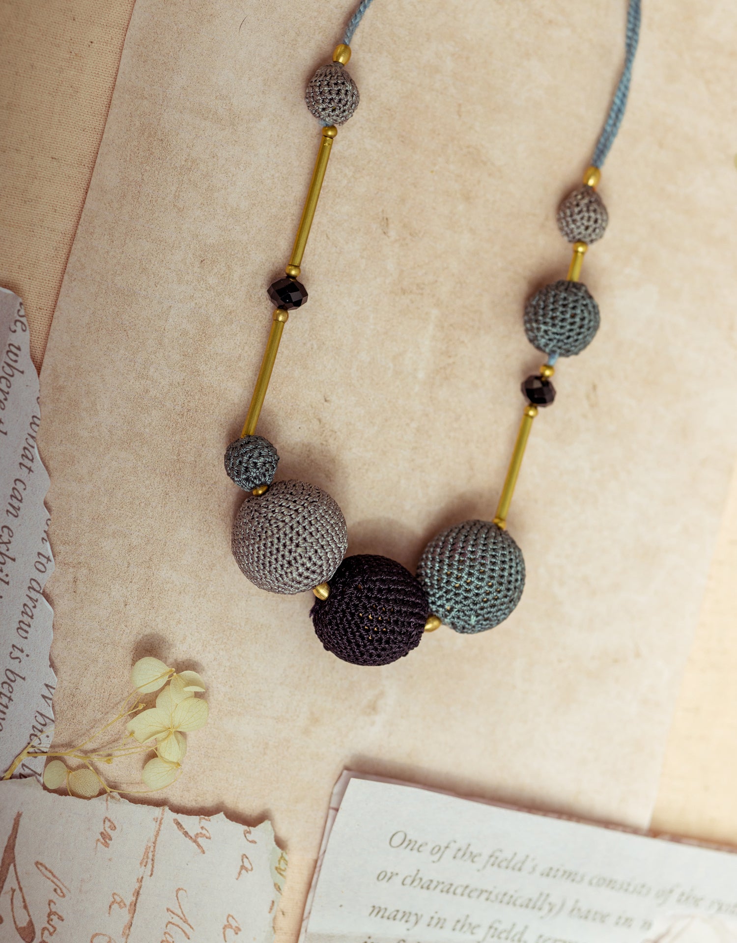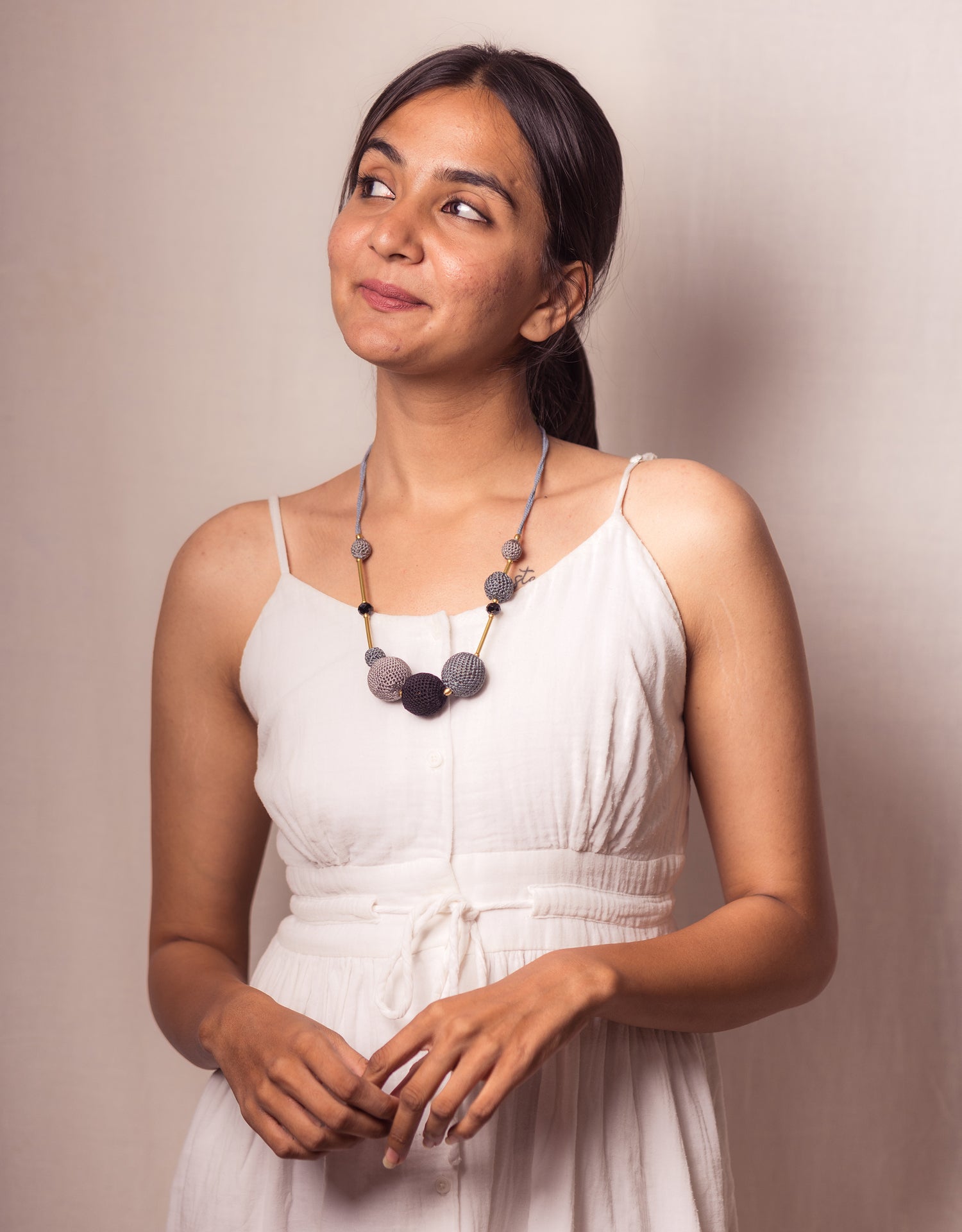 A medley of hand-crocheted beads in muted greys and charcoals, accented with sleek golden rods and faceted black beads, this piece offers quiet sophistication for every occasion. Lightweight, easy to wear, and effortlessly versatile—perfect for your boardroom looks, cultural outings, or laid-back weekends. Its soft grey yarn cord adds a delicate contrast, making it a graceful addition to your conscious wardrobe. Lovingly handcrafted by women artisans, this necklace carries a story of tradition, empowerment, and slow fashion.