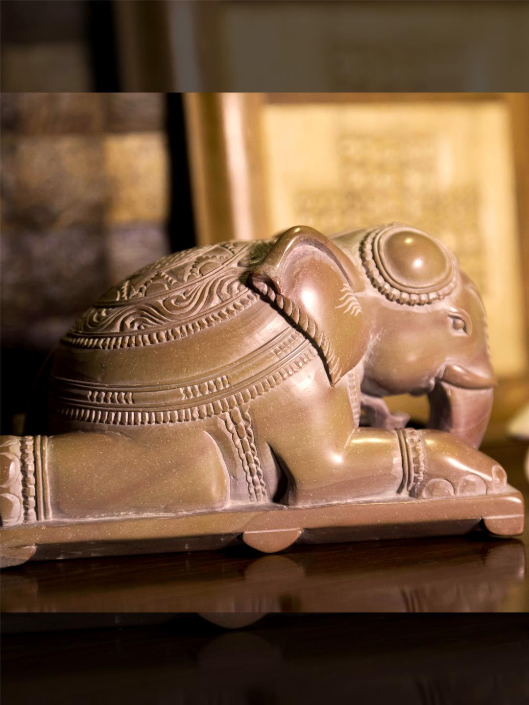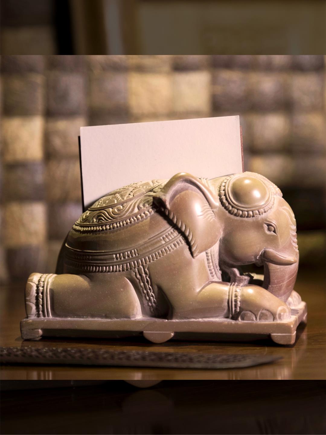 Product Features The couchant elephant represents the verdant earth in all her glory, as she submits herself willingly and lovingly to a trustworthy keeper. A timeless icon of material splendour, which once carried treasure and royal symbols for kings, the Hasti Holder carries a small but equally powerful icon of identity today — the business card. This handcrafted object represents beauty carved from the soul of India. Dimensions: 6 x3 x3.5
