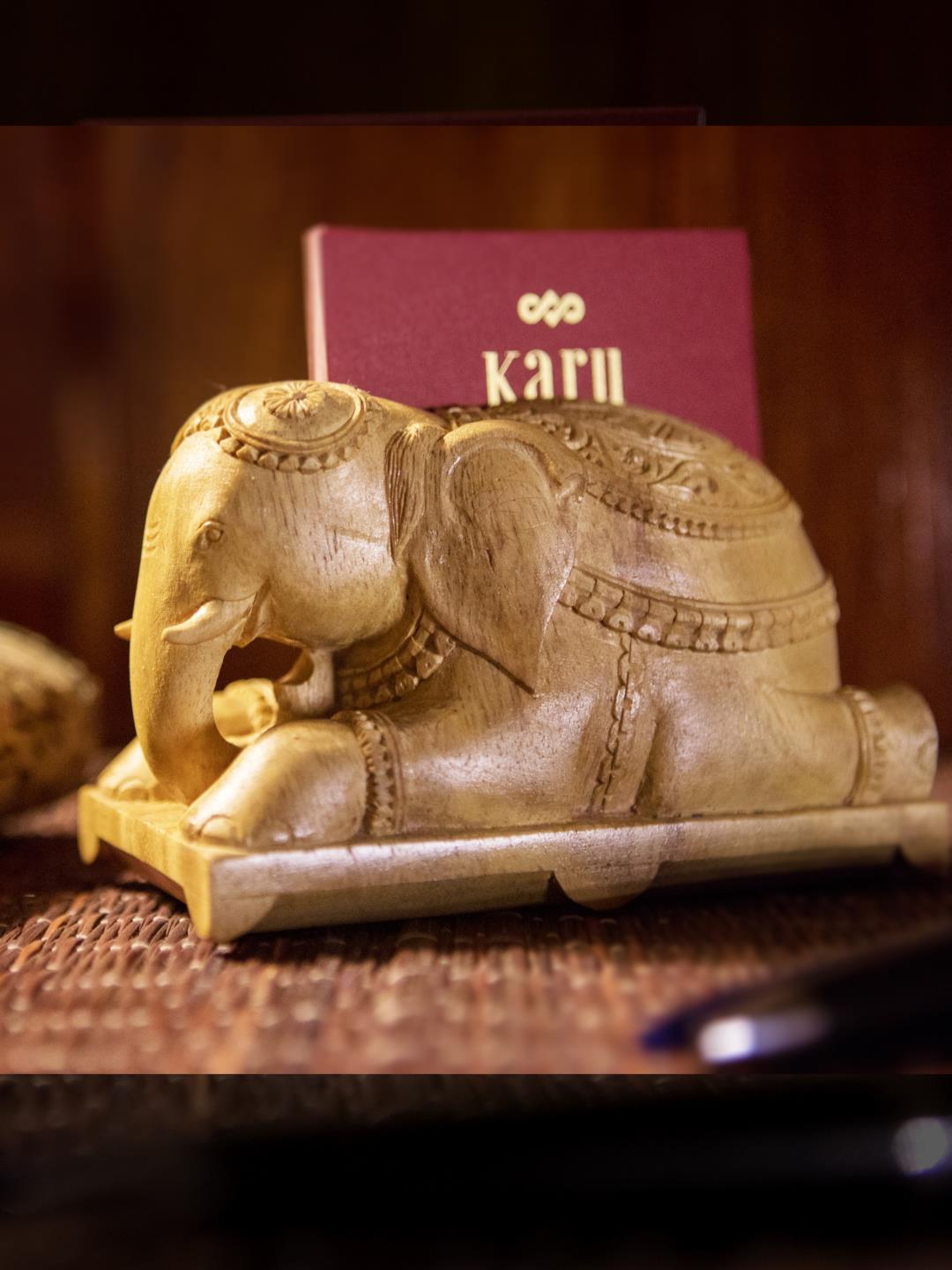 Product Features The couchant elephant represents the verdant earth in all her glory, as she submits herself willingly and lovingly to a trustworthy keeper. A timeless icon of material splendour, which once carried treasure and royal symbols for kings, the Hasti Holder carries a small but equally powerful icon of identity today — the business card. This handcrafted object represents beauty carved from the soul of India.